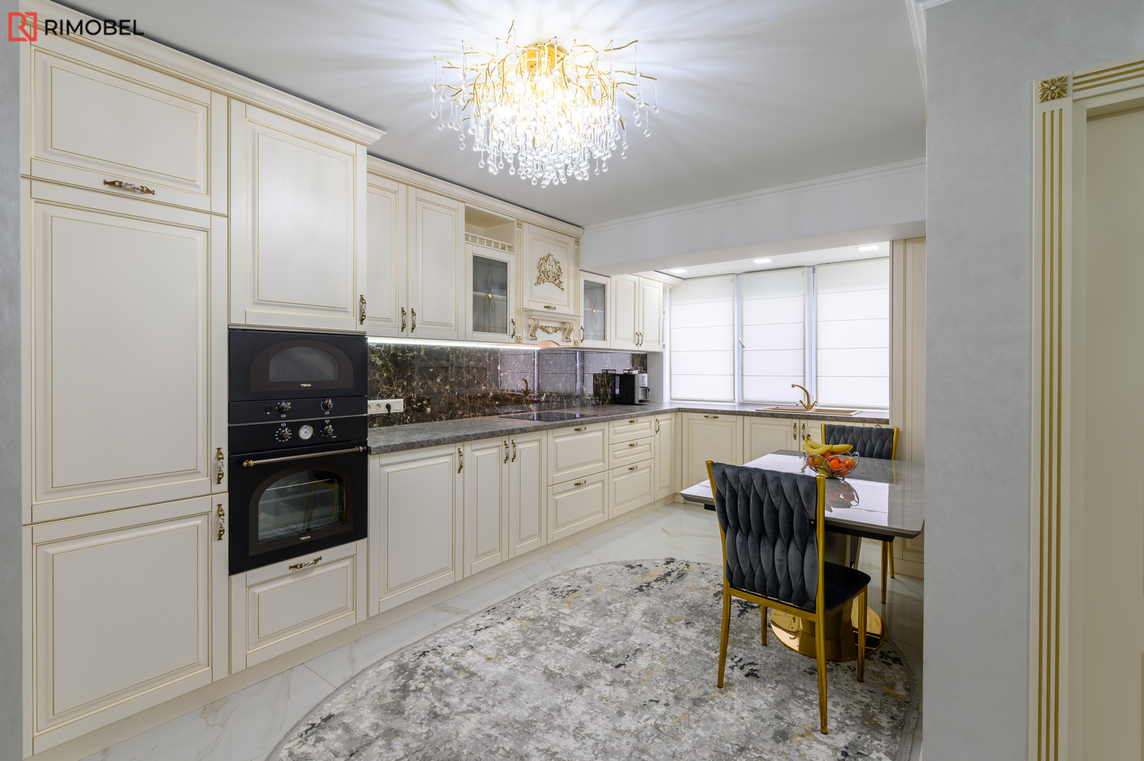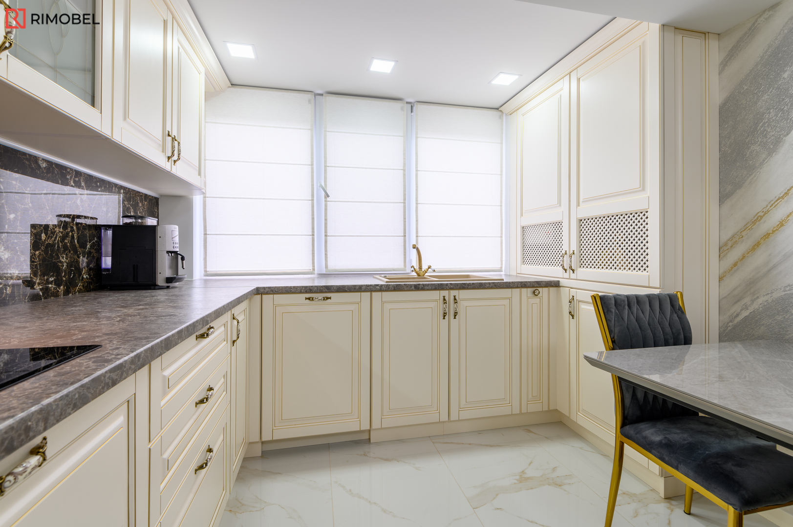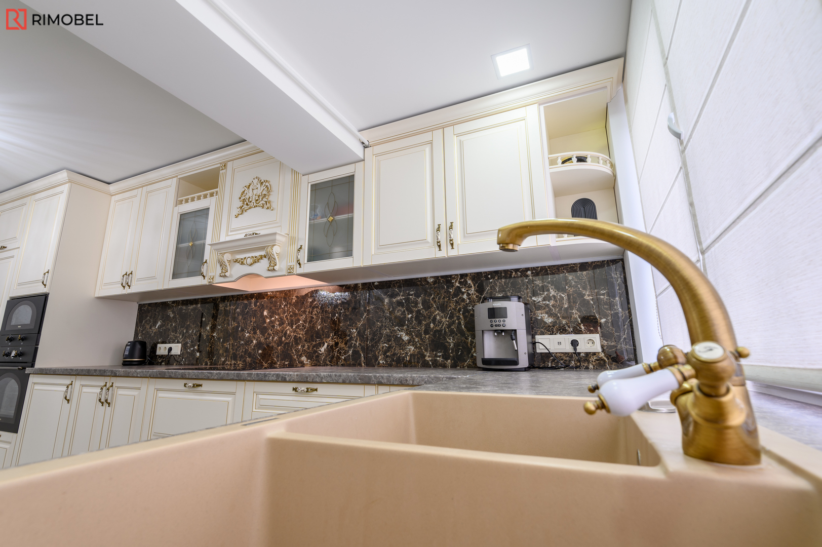 Fațadele din MDF frezat 3D, atent vopsite într-o paletă caldă și neutră, oferă volum, textură și un aspect sculptat discret, caracteristic stilului clasic reinterpretat. Formata în „L”, bucătăria este practică, aerisită și se încadrează ideal în spații medii sau mari, oferind o delimitare naturală a zonelor funcționale.