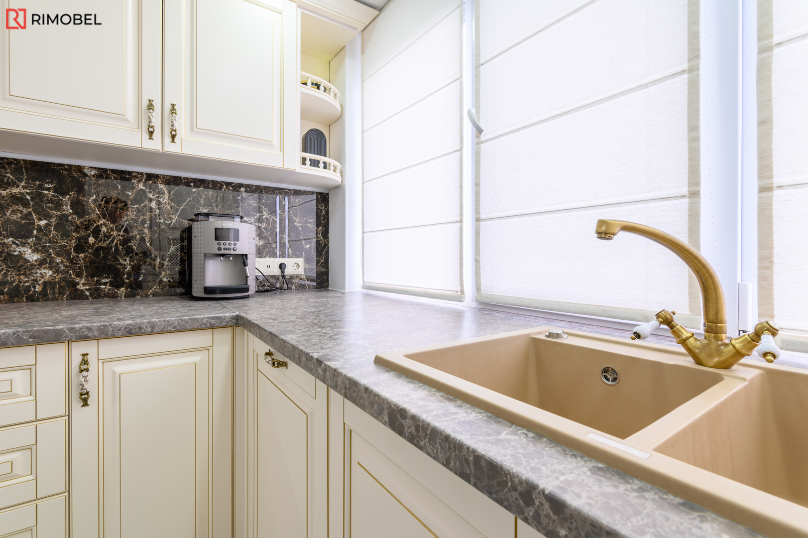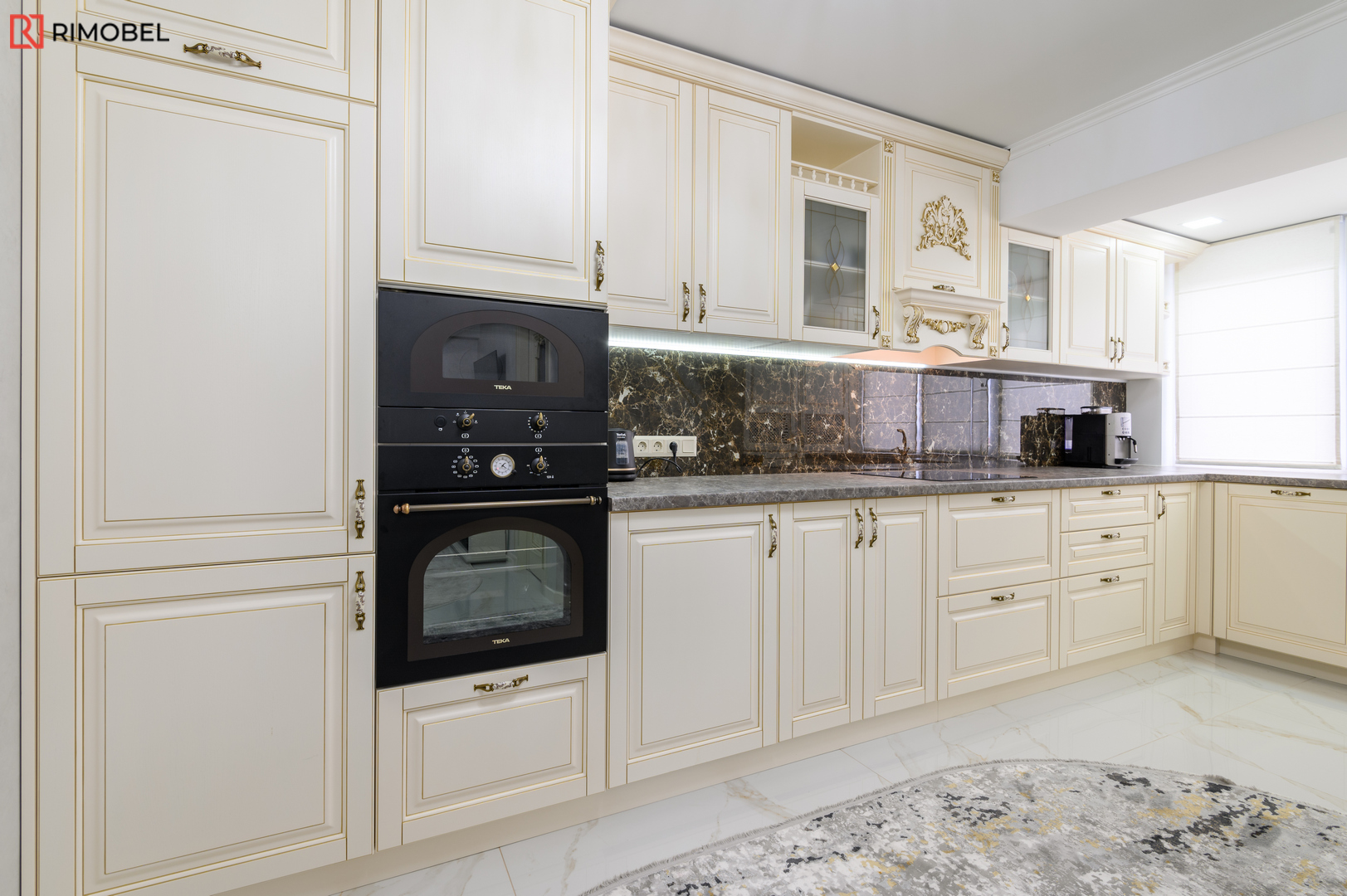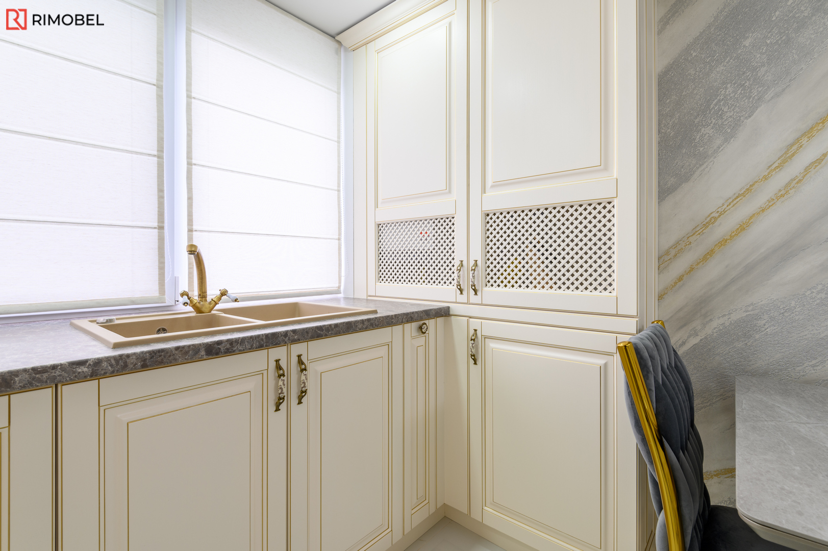 Fațadele din MDF frezat 3D, atent vopsite într-o paletă caldă și neutră, oferă volum, textură și un aspect sculptat discret, caracteristic stilului clasic reinterpretat. Formata în „L”, bucătăria este practică, aerisită și se încadrează ideal în spații medii sau mari, oferind o delimitare naturală a zonelor funcționale.