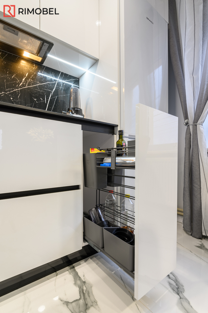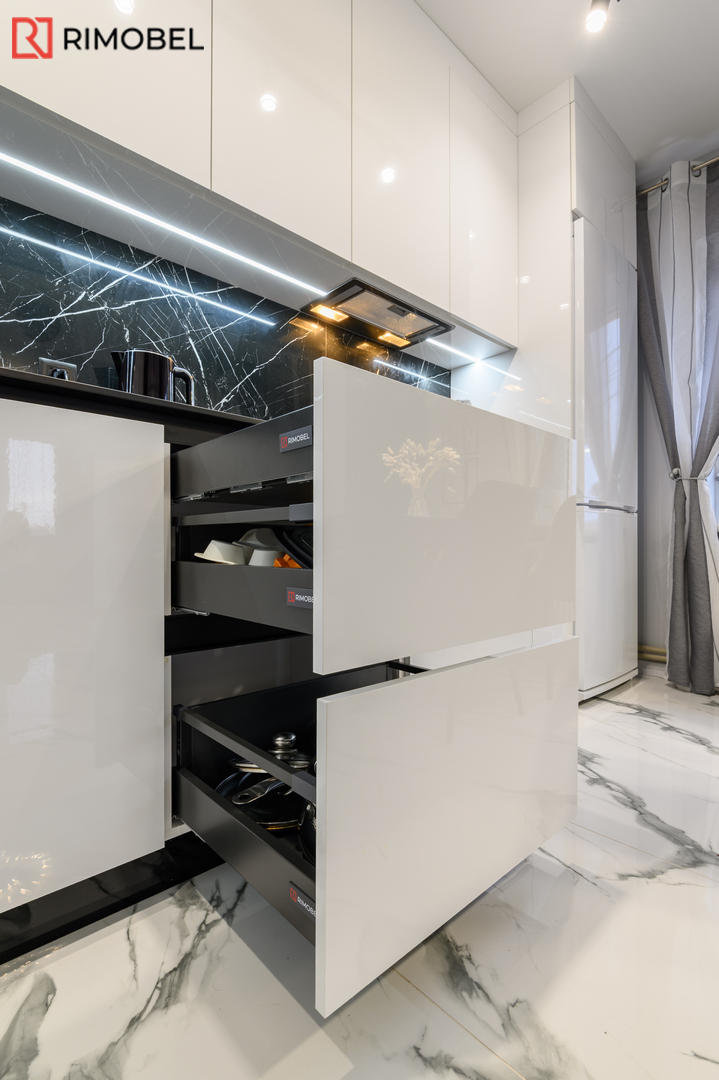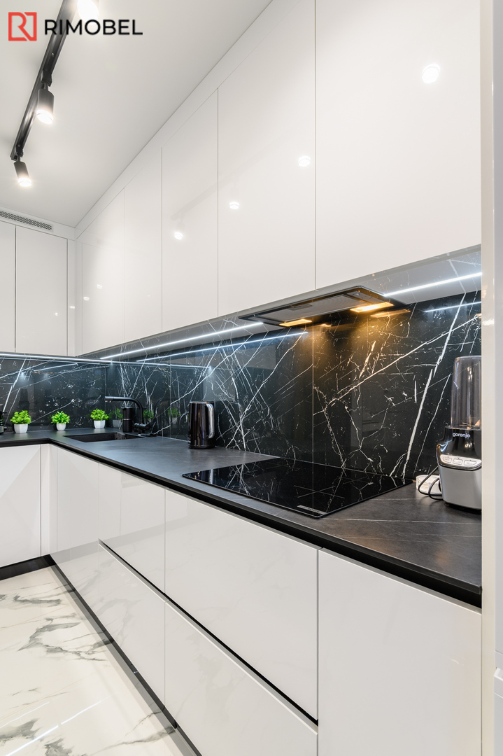 Bucătărie modernă în „L” – Alb lucios & funcționalitate germană