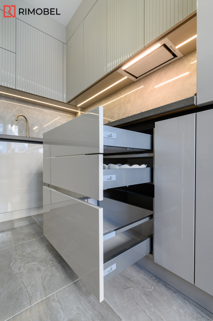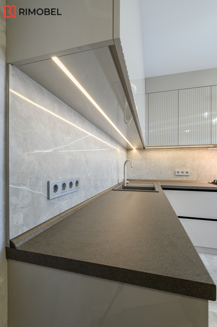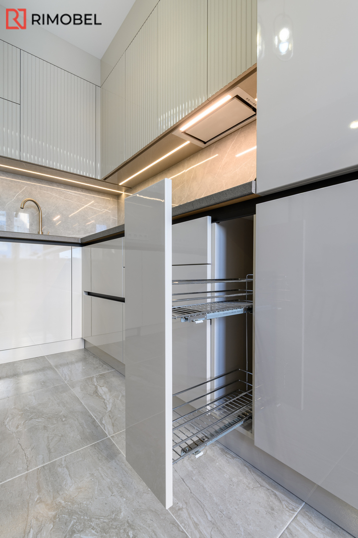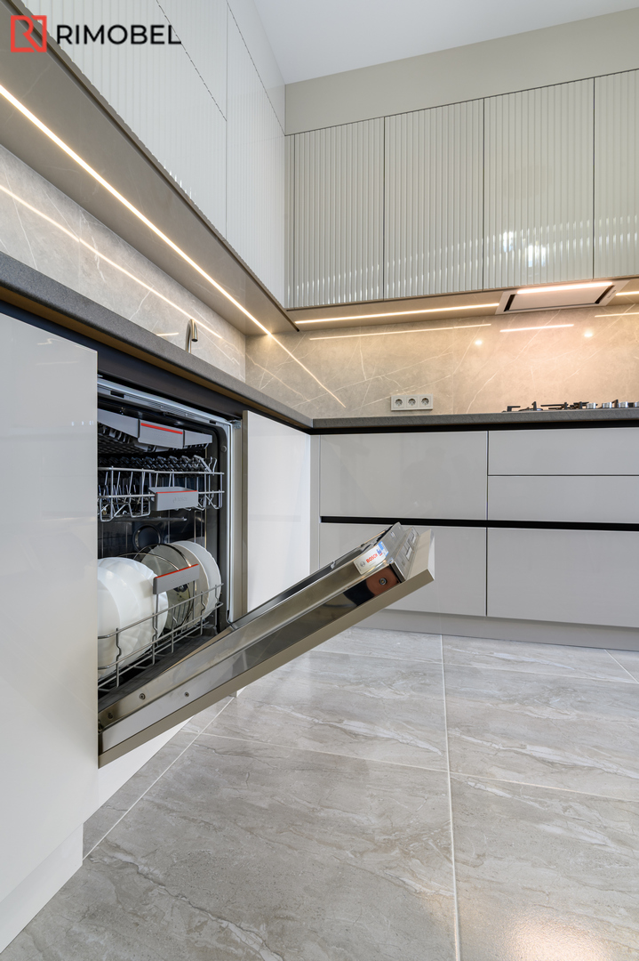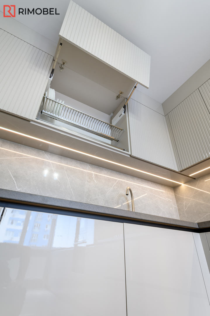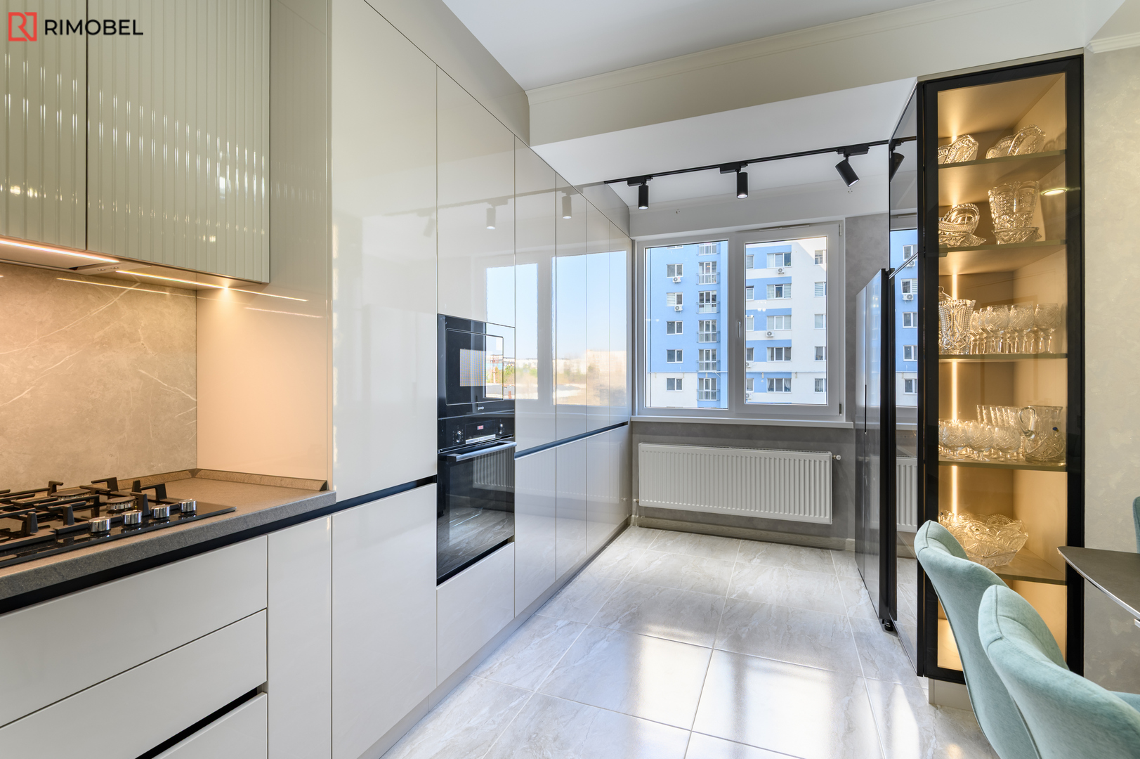 Luminoasă, practică și atent finisată – această bucătărie modernă realizată de Rimobel în Chișinău impresionează prin echilibrul între funcționalitate și estetică. Fațadele din MDF vopsit lucios, într-o nuanță caldă de bej, reflectă discret lumina, creând un ambient aerisit și contemporan.