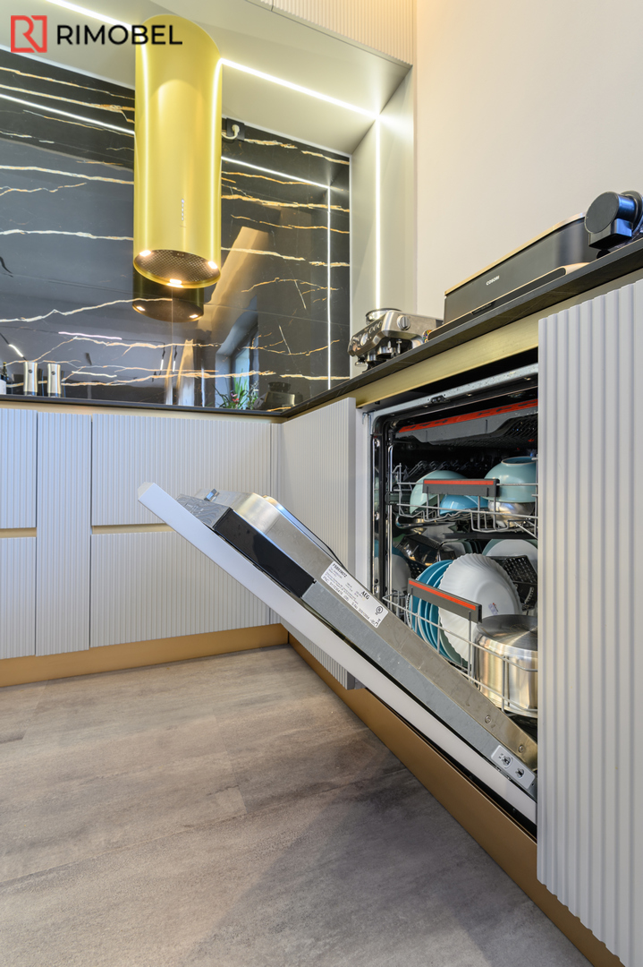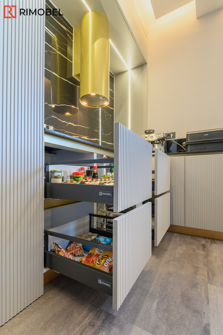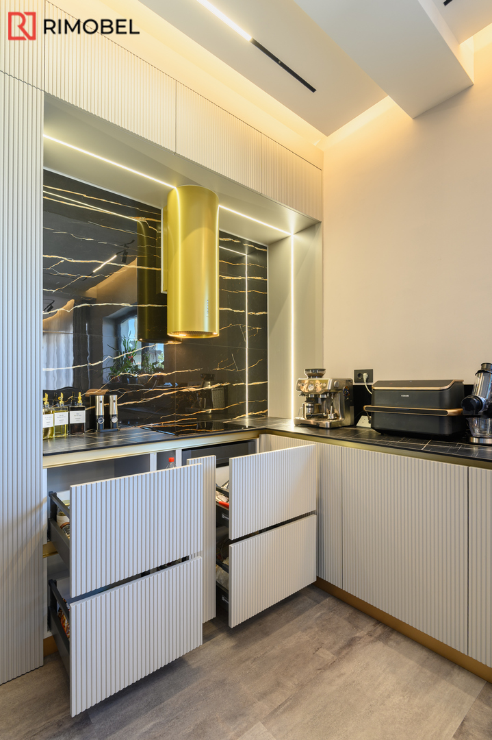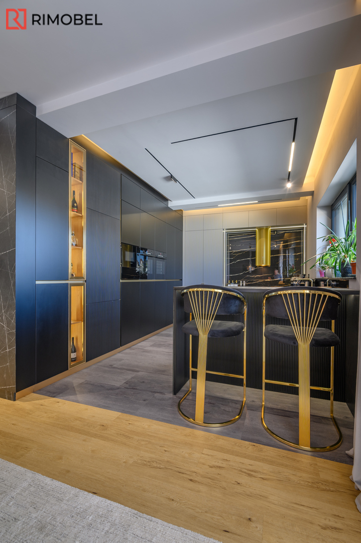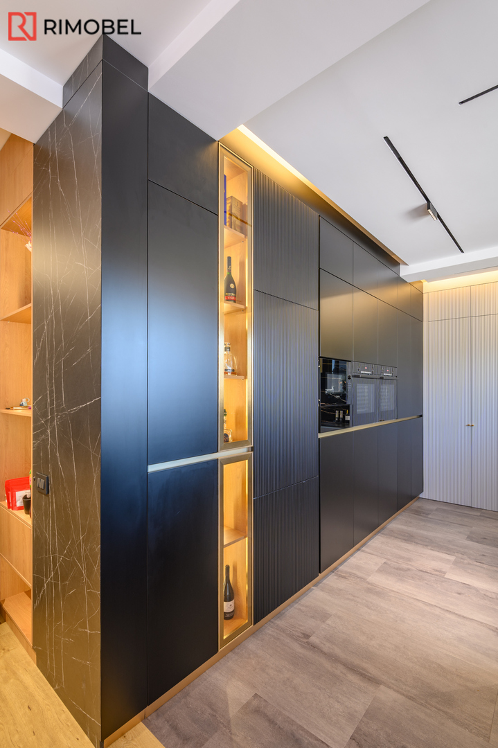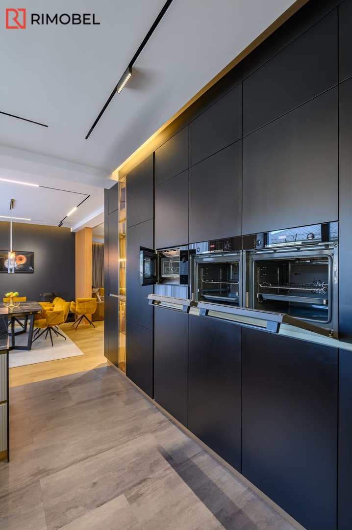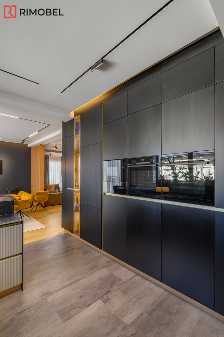 Această bucătărie modernă în formă de „U”, realizată la comandă de compania Rimobel, reprezintă combinația perfectă dintre design minimalist, materiale premium și mecanisme performante. Proiectată la dimensiuni individuale, bucătăria este adaptată complet spațiului și stilului de viață al beneficiarului.