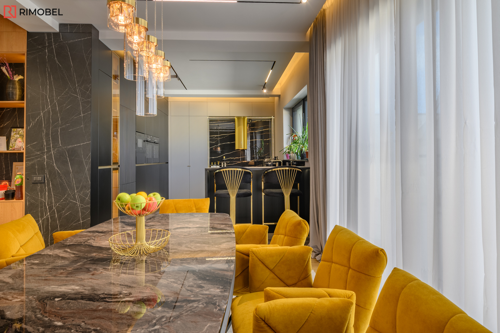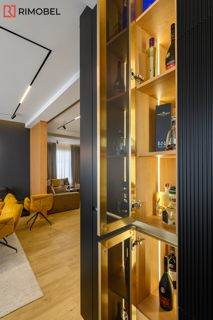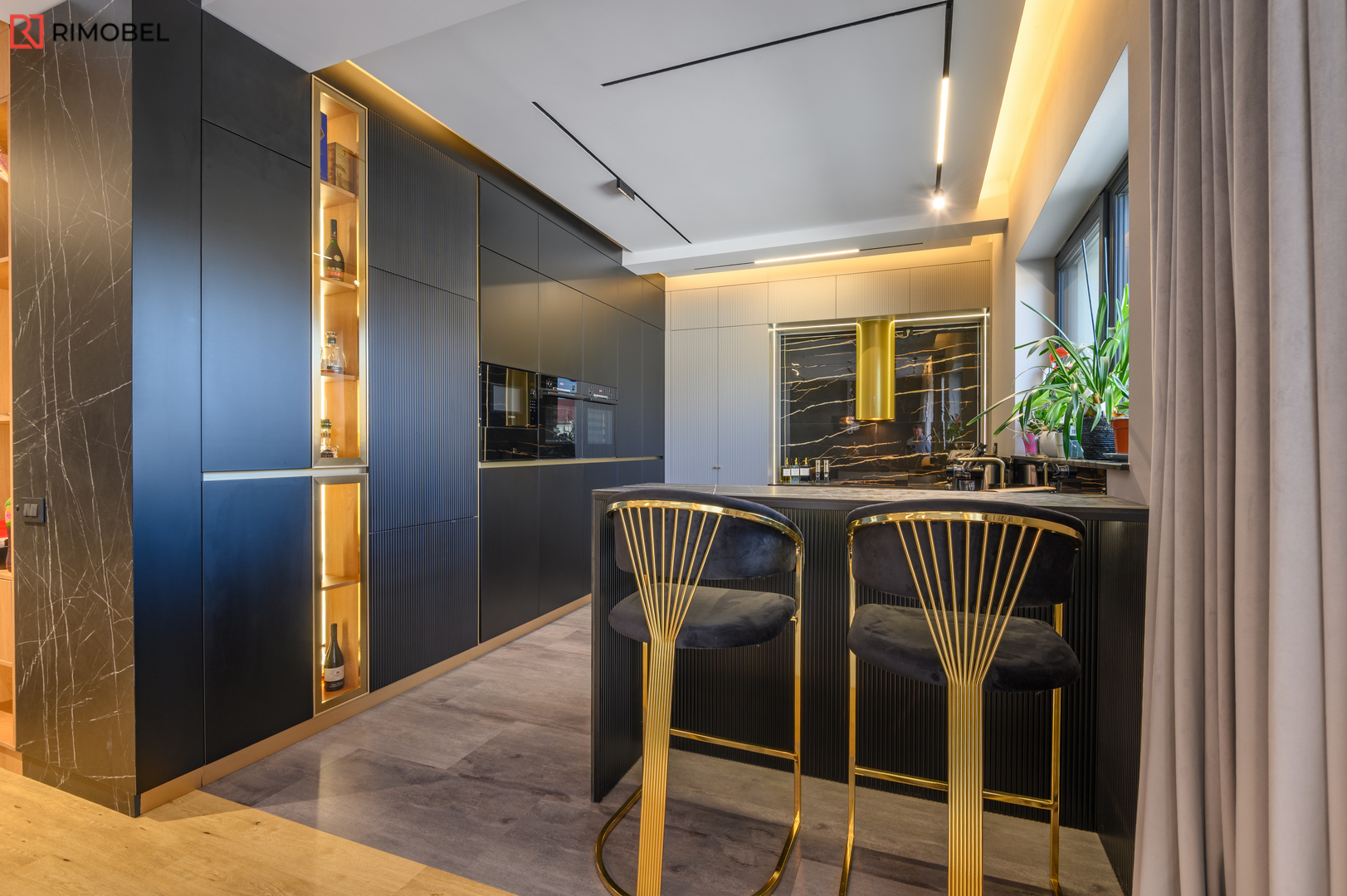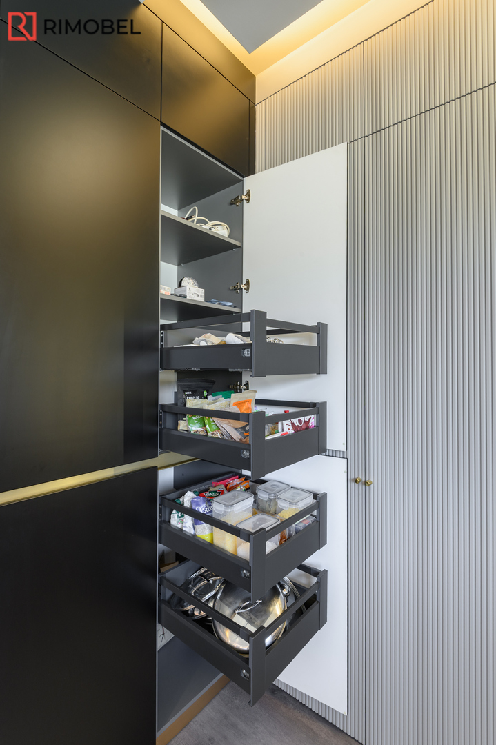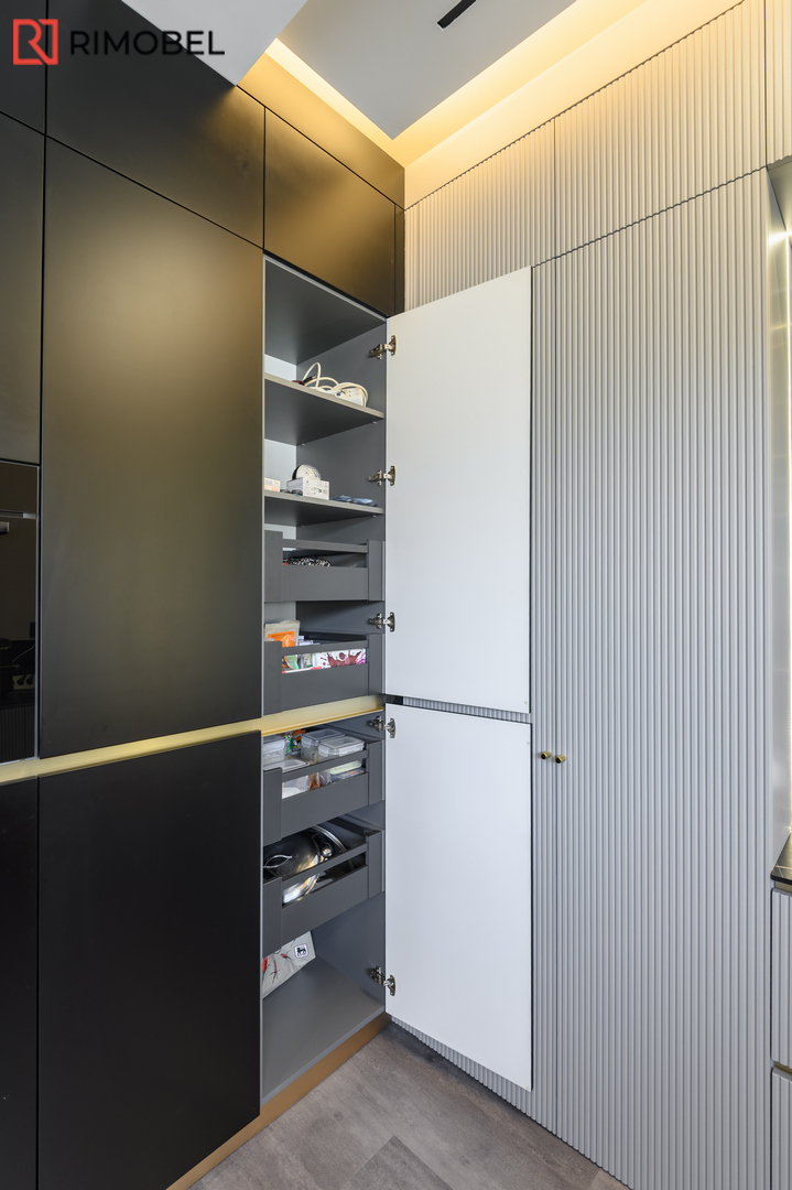 Această bucătărie modernă în formă de „U”, realizată la comandă de compania Rimobel, reprezintă combinația perfectă dintre design minimalist, materiale premium și mecanisme performante. Proiectată la dimensiuni individuale, bucătăria este adaptată complet spațiului și stilului de viață al beneficiarului.