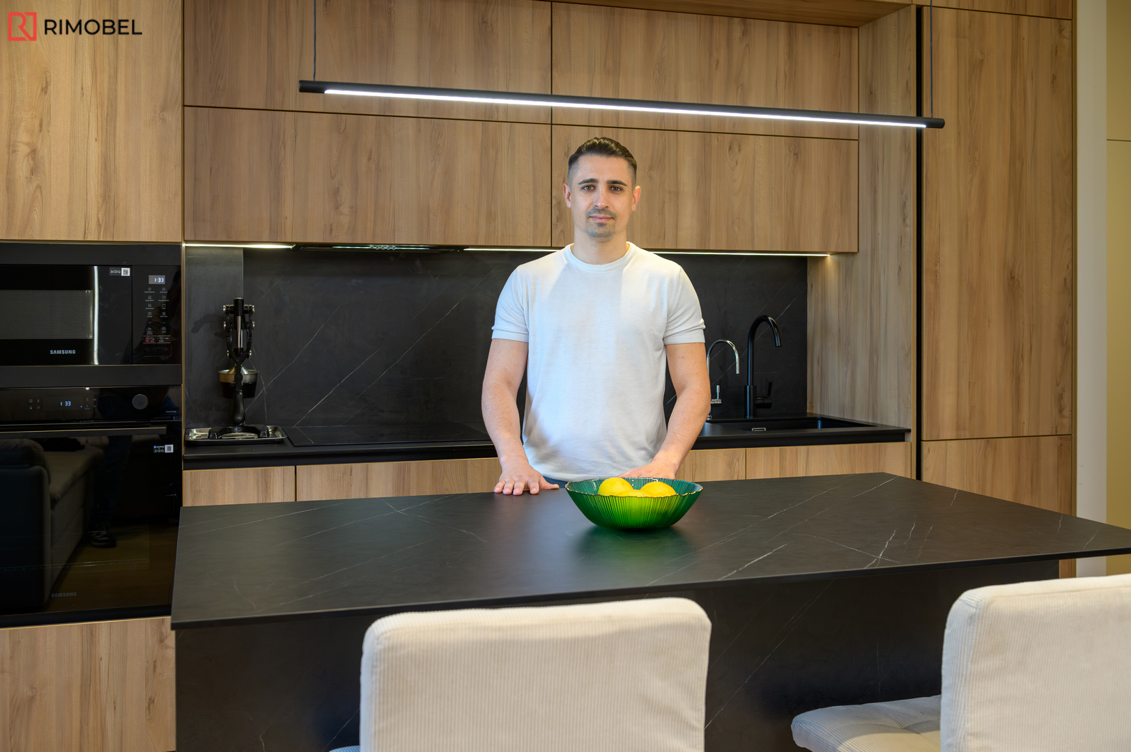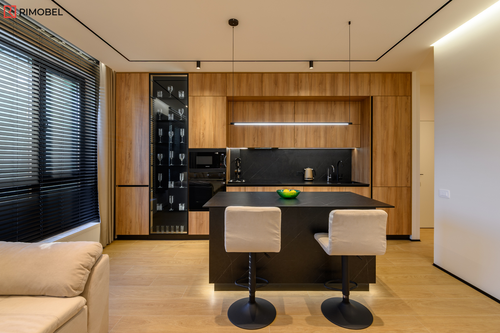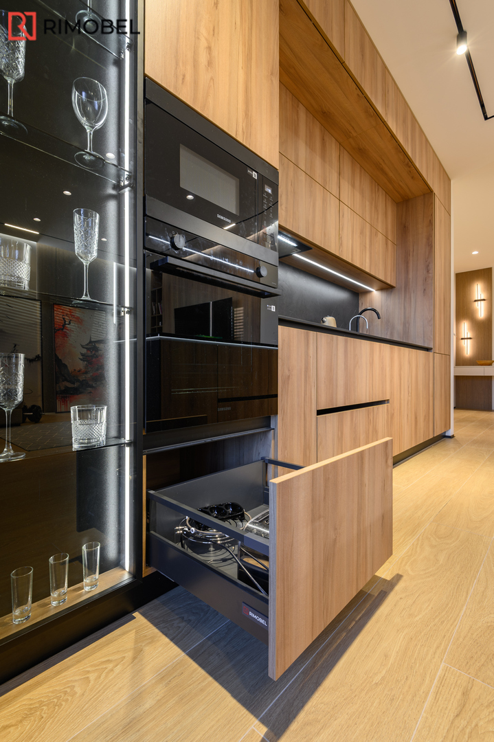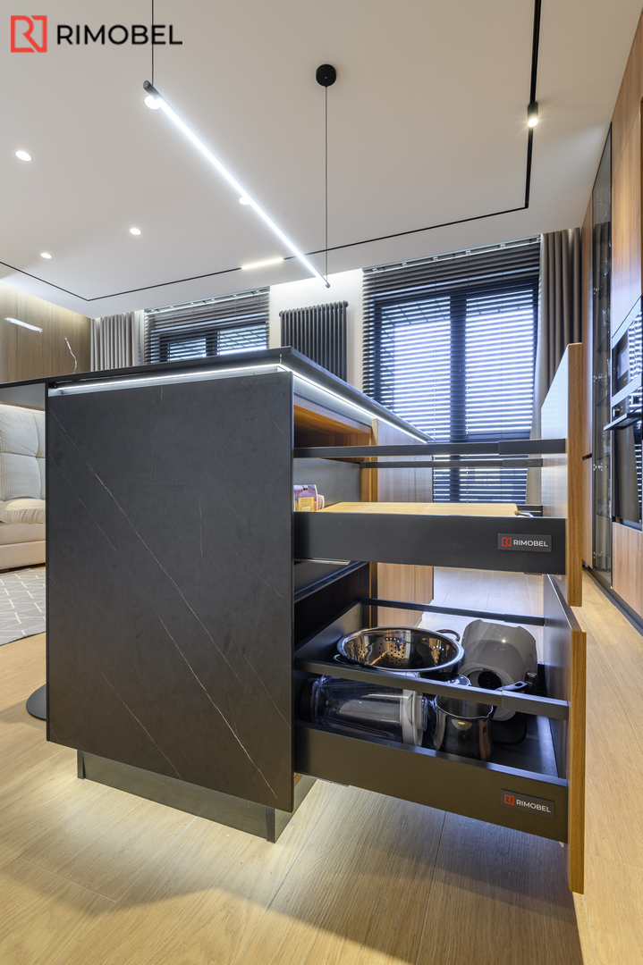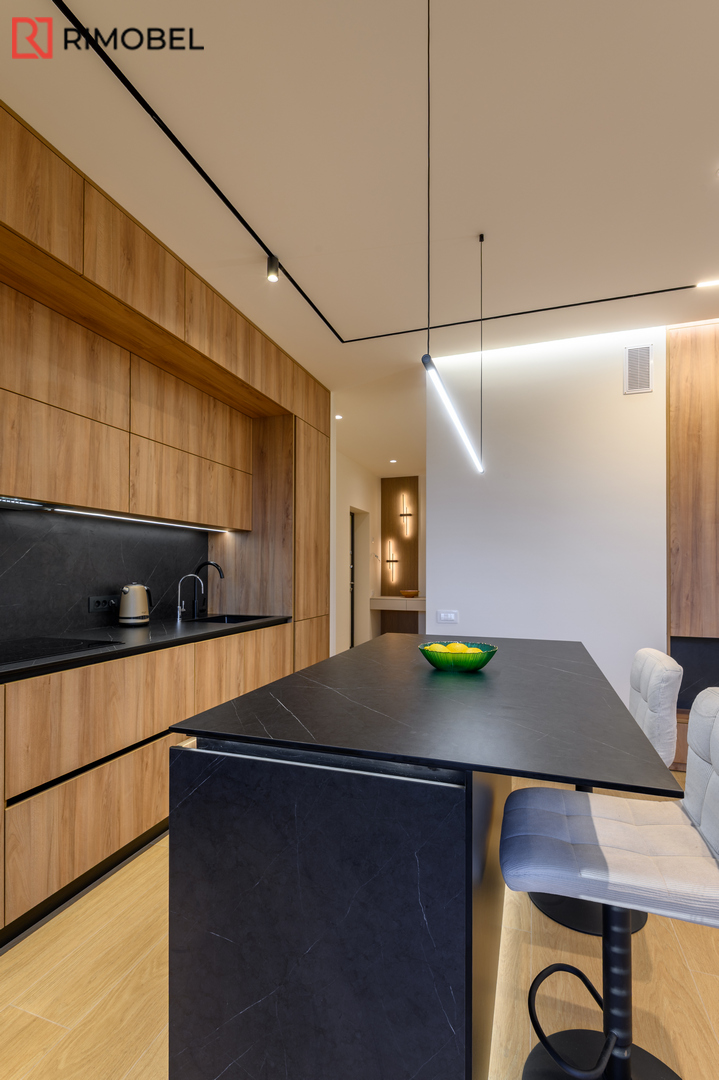 Această bucătărie modernă cu insulă, realizată la comandă de compania Rimobel în Republica Moldova, impresionează prin echilibrul perfect dintre estetică și funcționalitate. Combinația dintre fațadele cu textură lemnoasă și blatul HPL negru creează un contrast elegant, actual și ușor de integrat într-un interior contemporan.