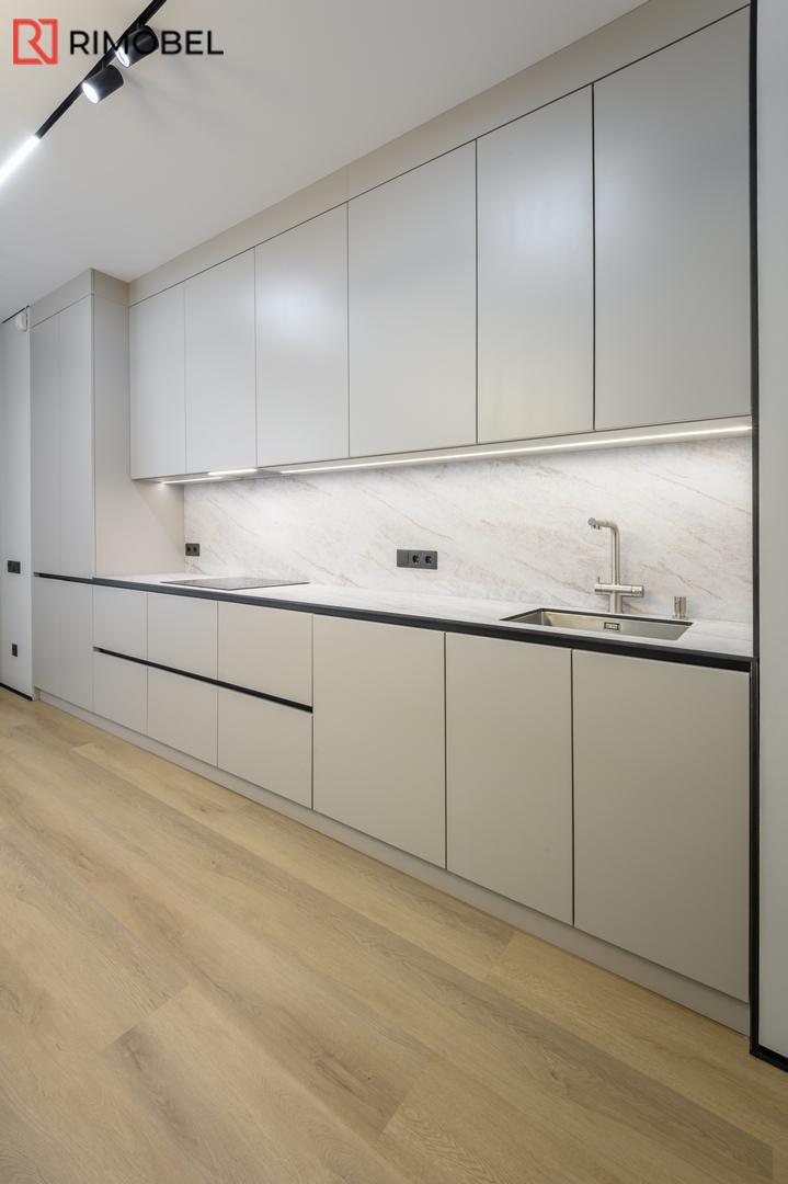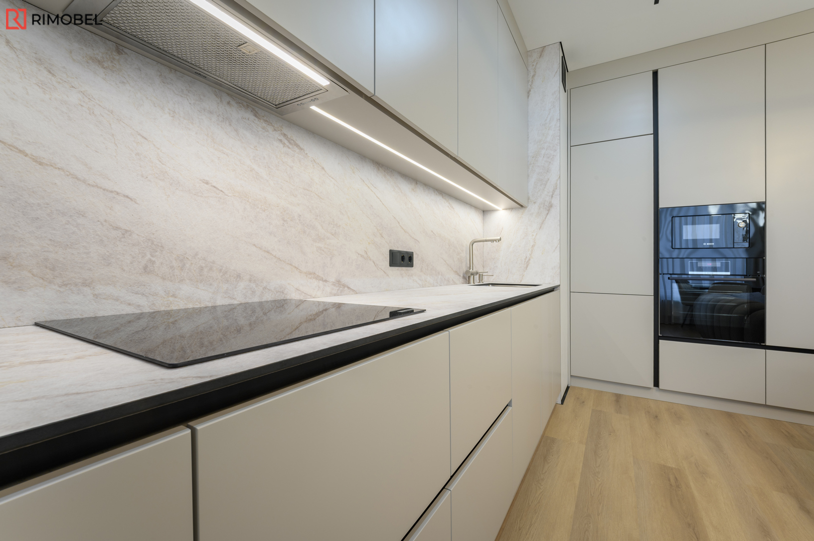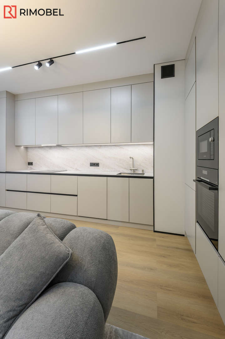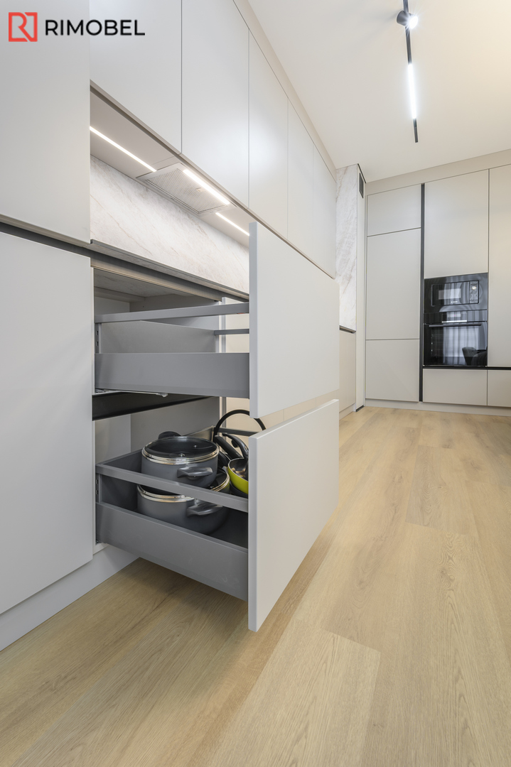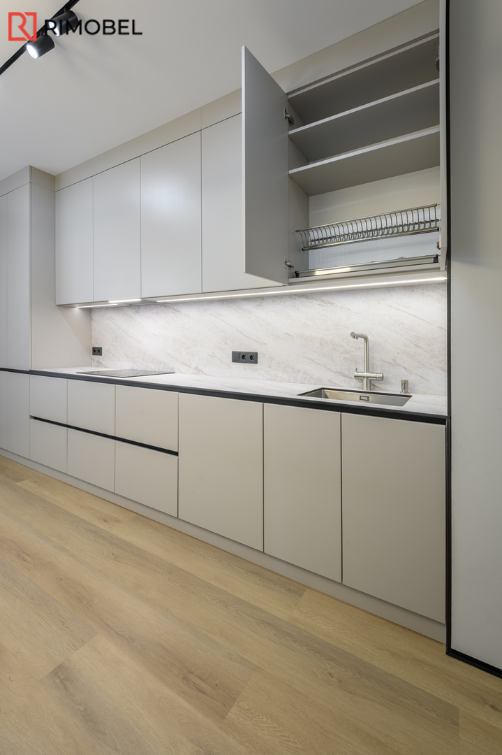 Această bucătărie modernă în formă de „L”, realizată la comandă de compania Rimobel, combină estetica minimalistă cu funcționalitatea inteligentă. Configurația în „L” optimizează spațiul, oferind zone ergonomice pentru gătit, depozitare și pregătirea meselor. Fiecare detaliu a fost gândit pentru a crea un ambient elegant, dar practic în utilizarea zilnică.