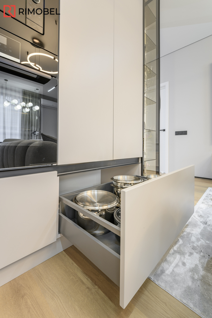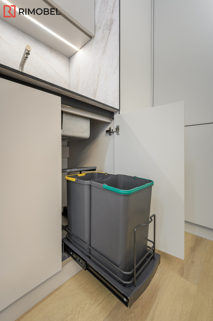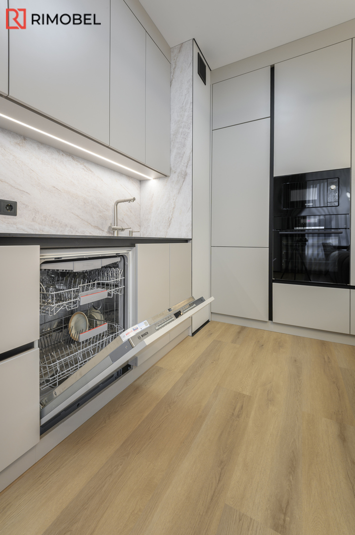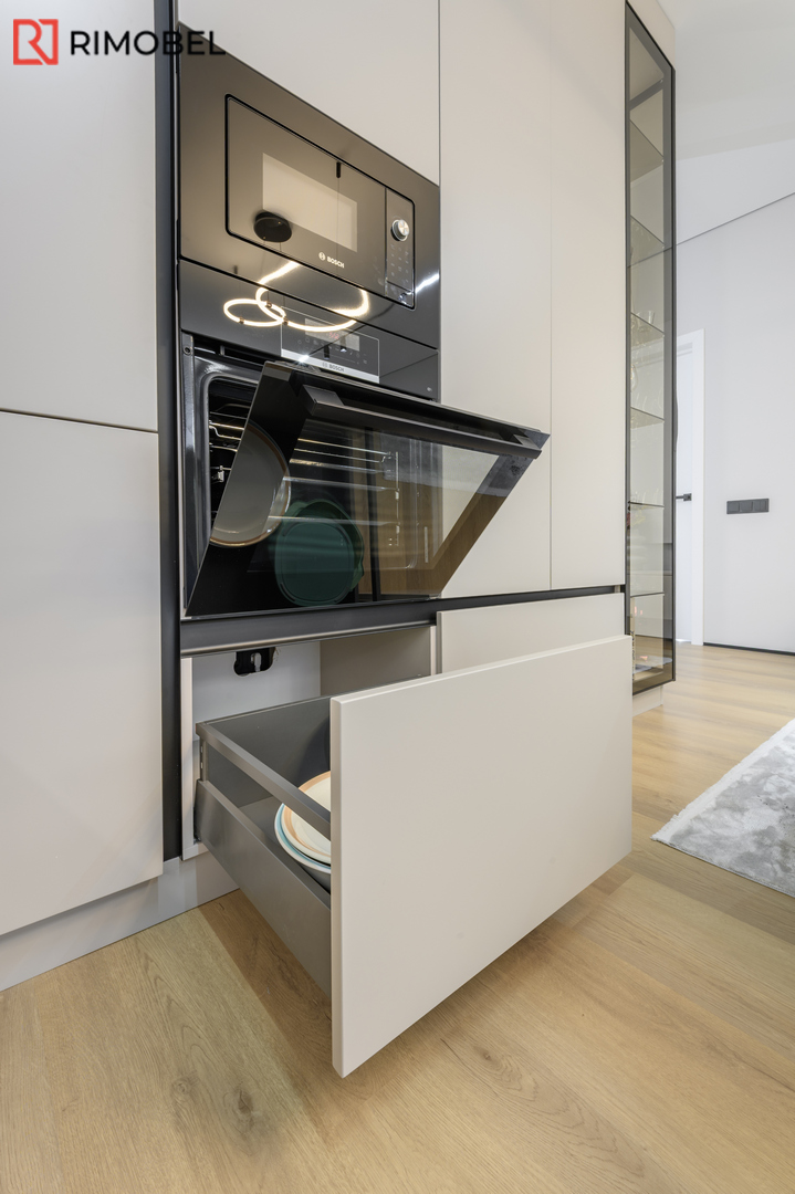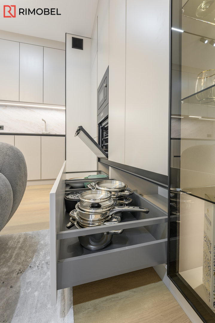 Această bucătărie modernă în formă de „L”, realizată la comandă de compania Rimobel, combină estetica minimalistă cu funcționalitatea inteligentă. Configurația în „L” optimizează spațiul, oferind zone ergonomice pentru gătit, depozitare și pregătirea meselor. Fiecare detaliu a fost gândit pentru a crea un ambient elegant, dar practic în utilizarea zilnică.