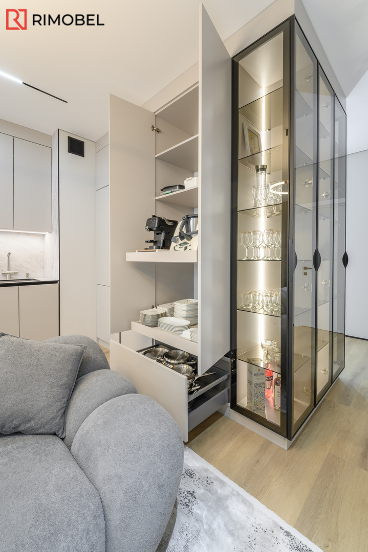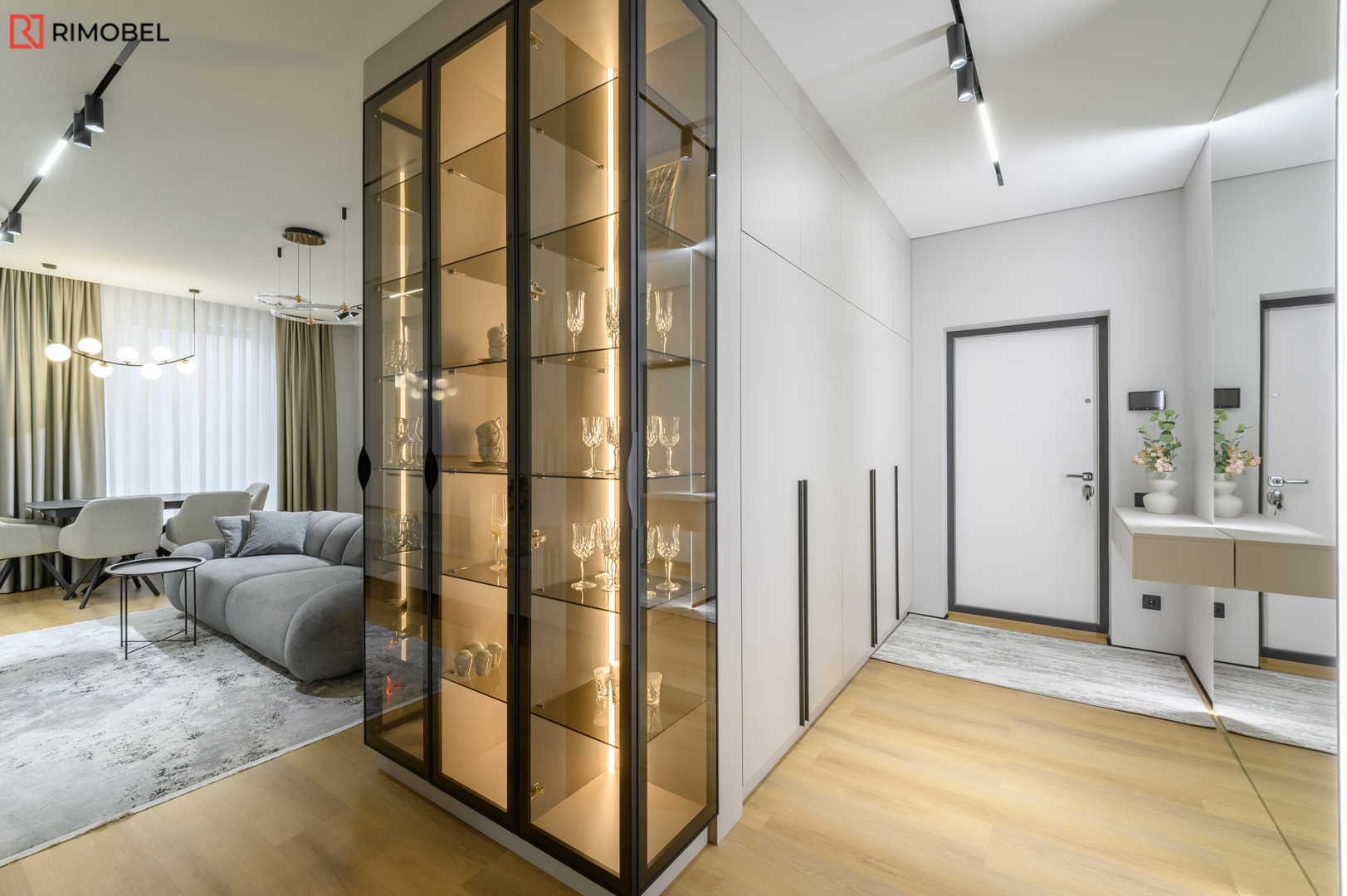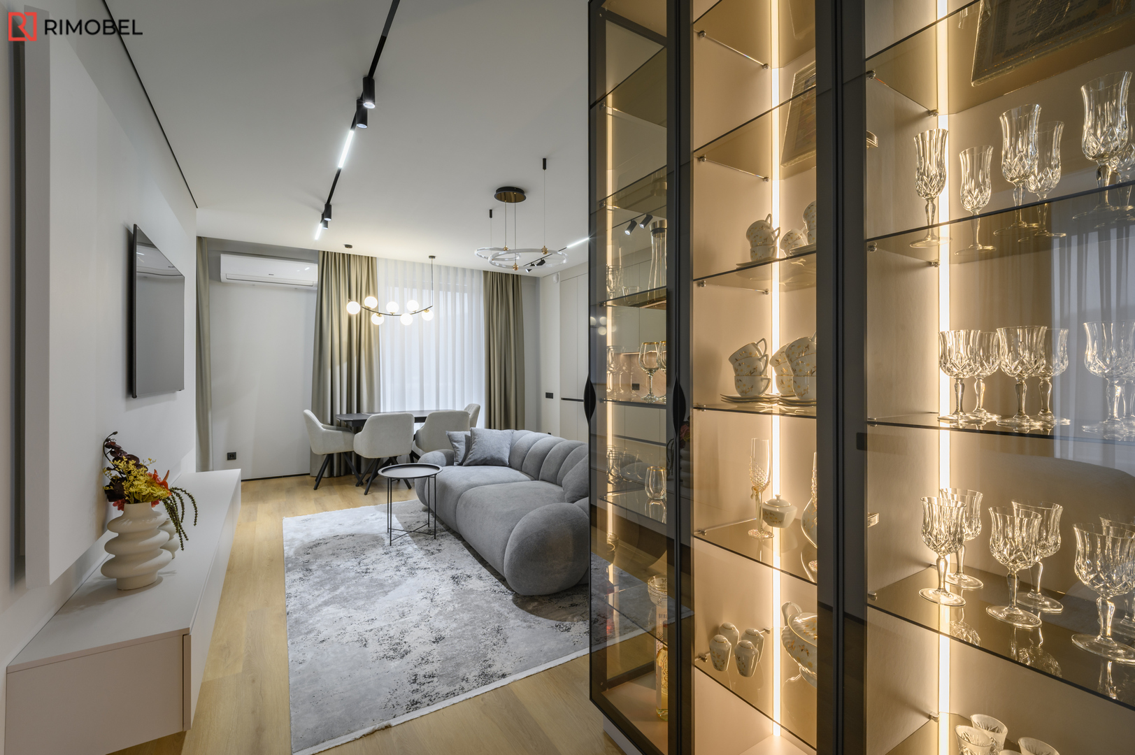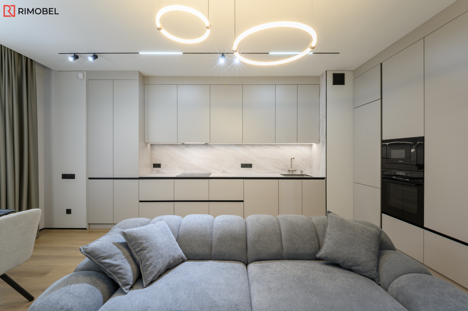 Această bucătărie modernă în formă de „L”, realizată la comandă de compania Rimobel, combină estetica minimalistă cu funcționalitatea inteligentă. Configurația în „L” optimizează spațiul, oferind zone ergonomice pentru gătit, depozitare și pregătirea meselor. Fiecare detaliu a fost gândit pentru a crea un ambient elegant, dar practic în utilizarea zilnică.
