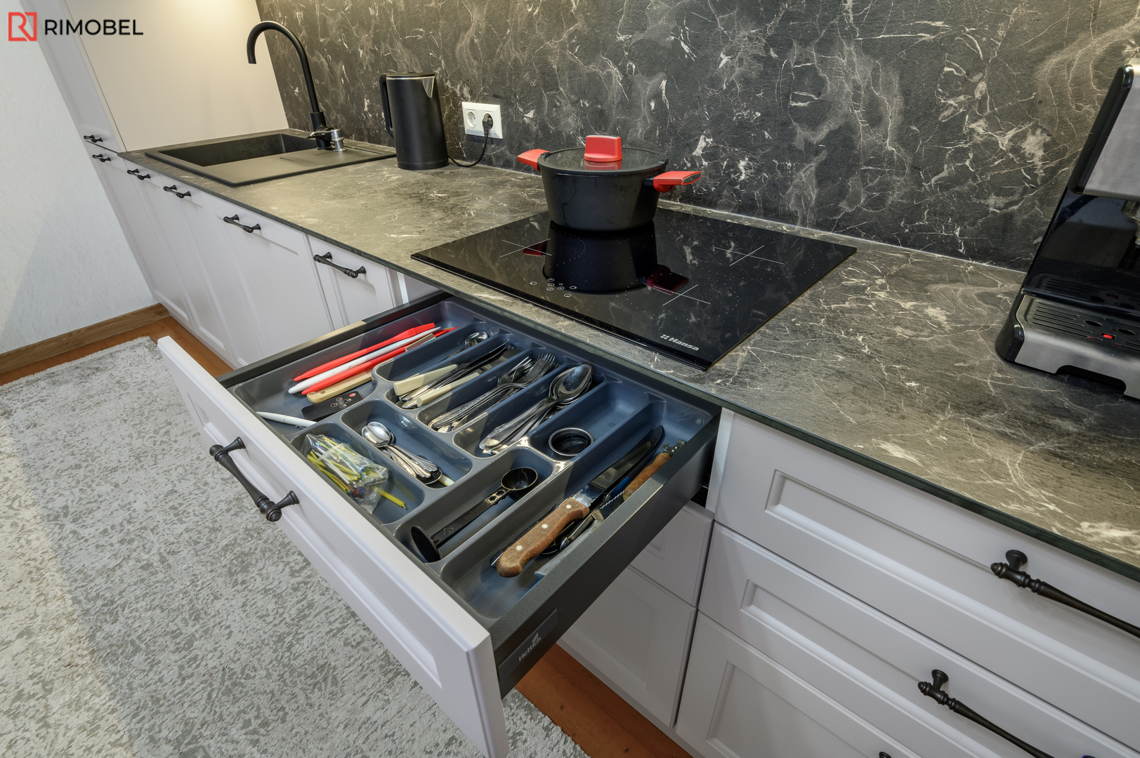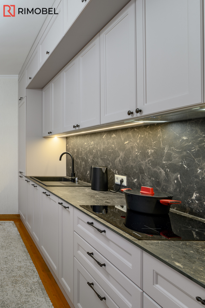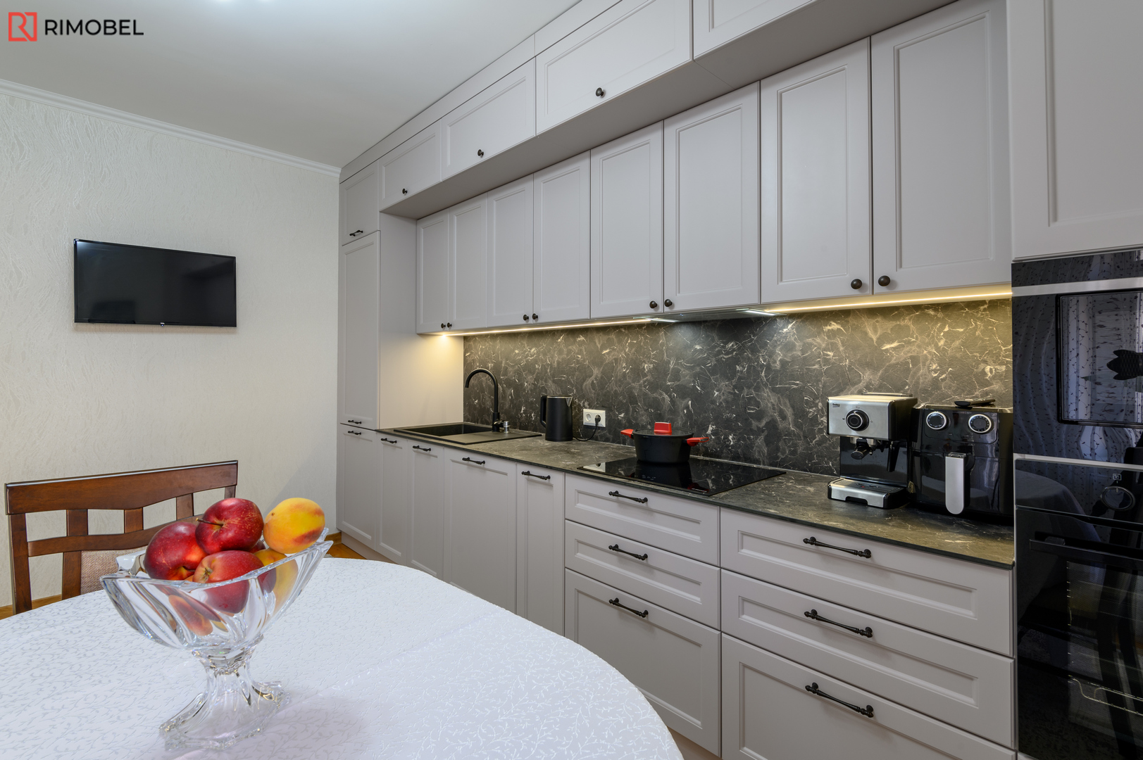 Bucătărie neoclasică liniară – Alb elegant & funcționalitate rafinată