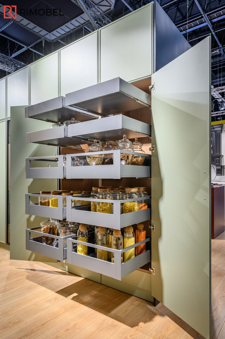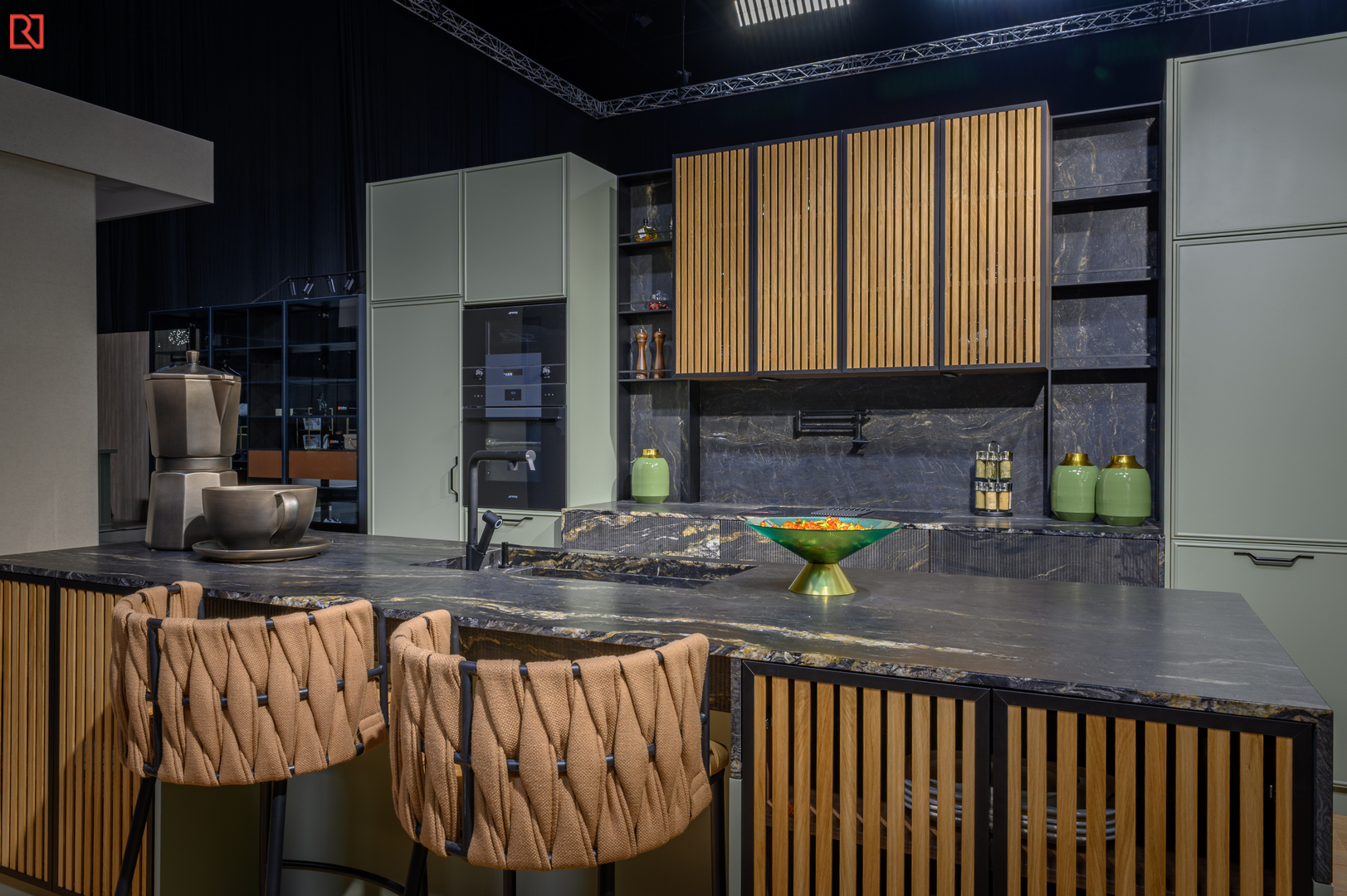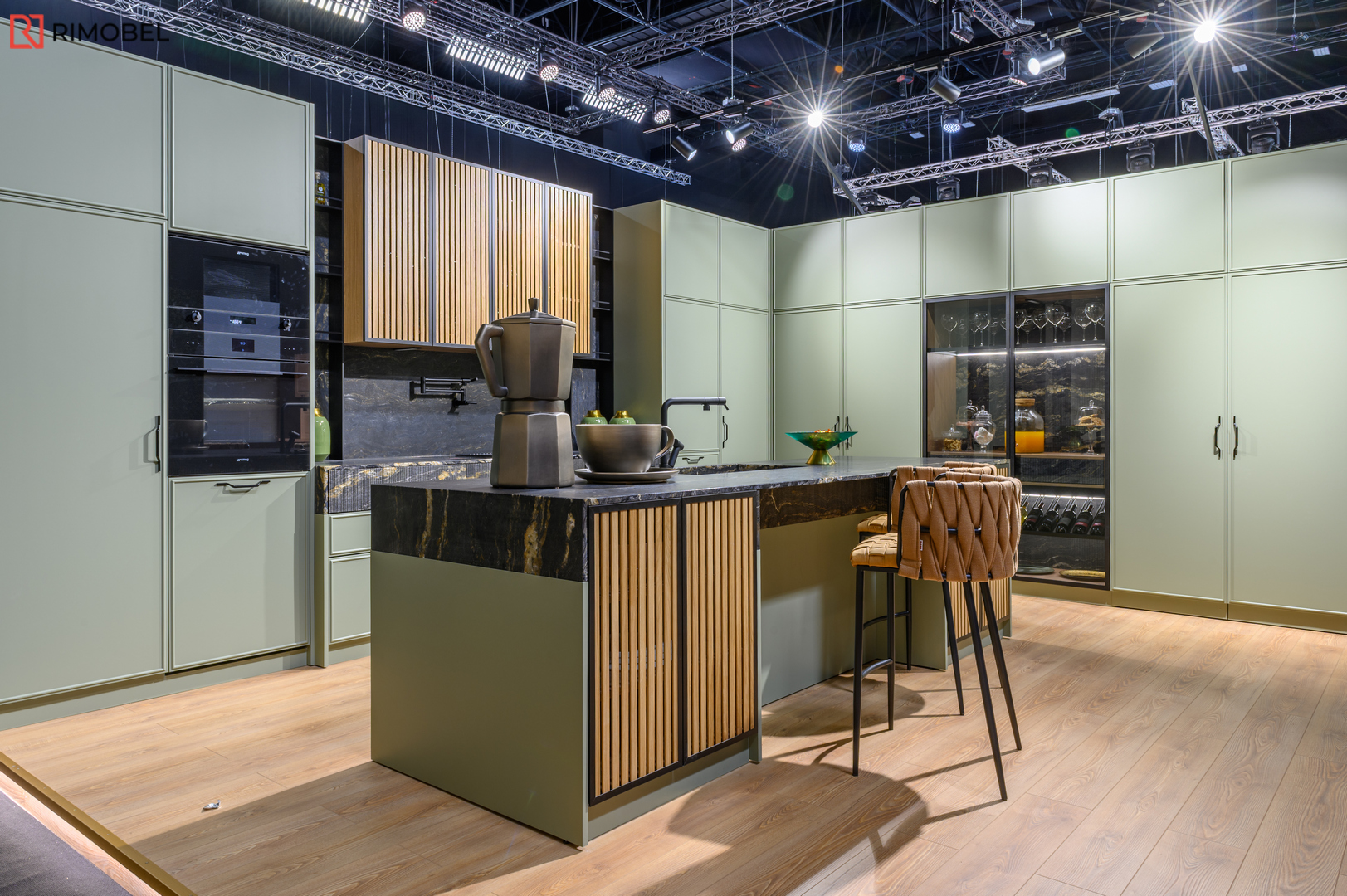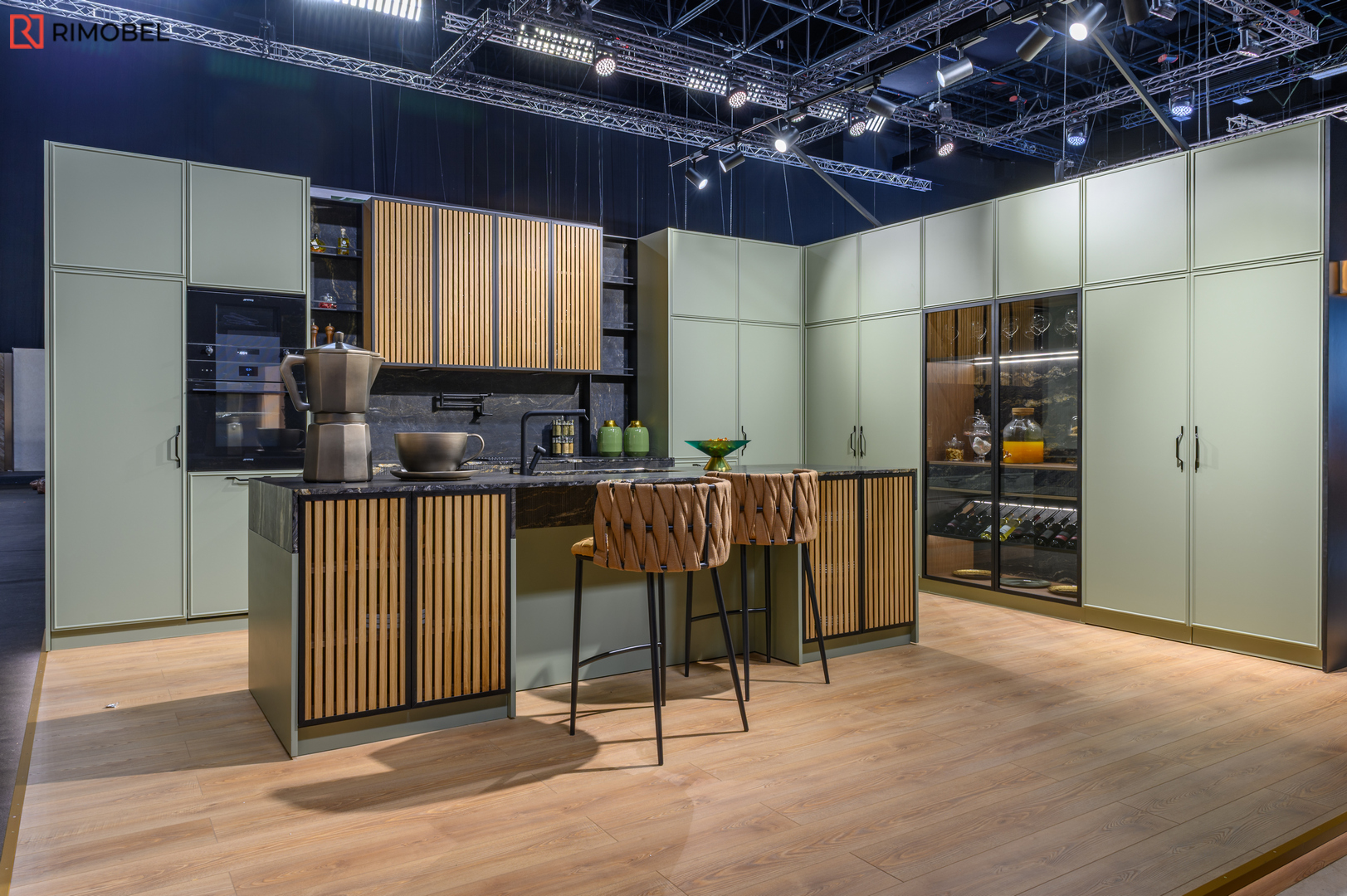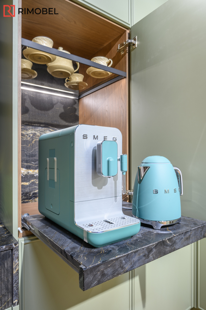 Un omagiu adus rafinamentului atemporal, această bucătărie neoclasică Rimobel, realizată în Republica Moldova, impresionează prin contrastul subtil dintre nuanța de verde fistic, detaliile aurii și tehnologia de ultimă generație.