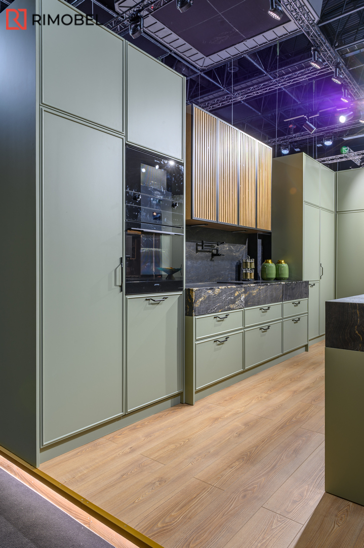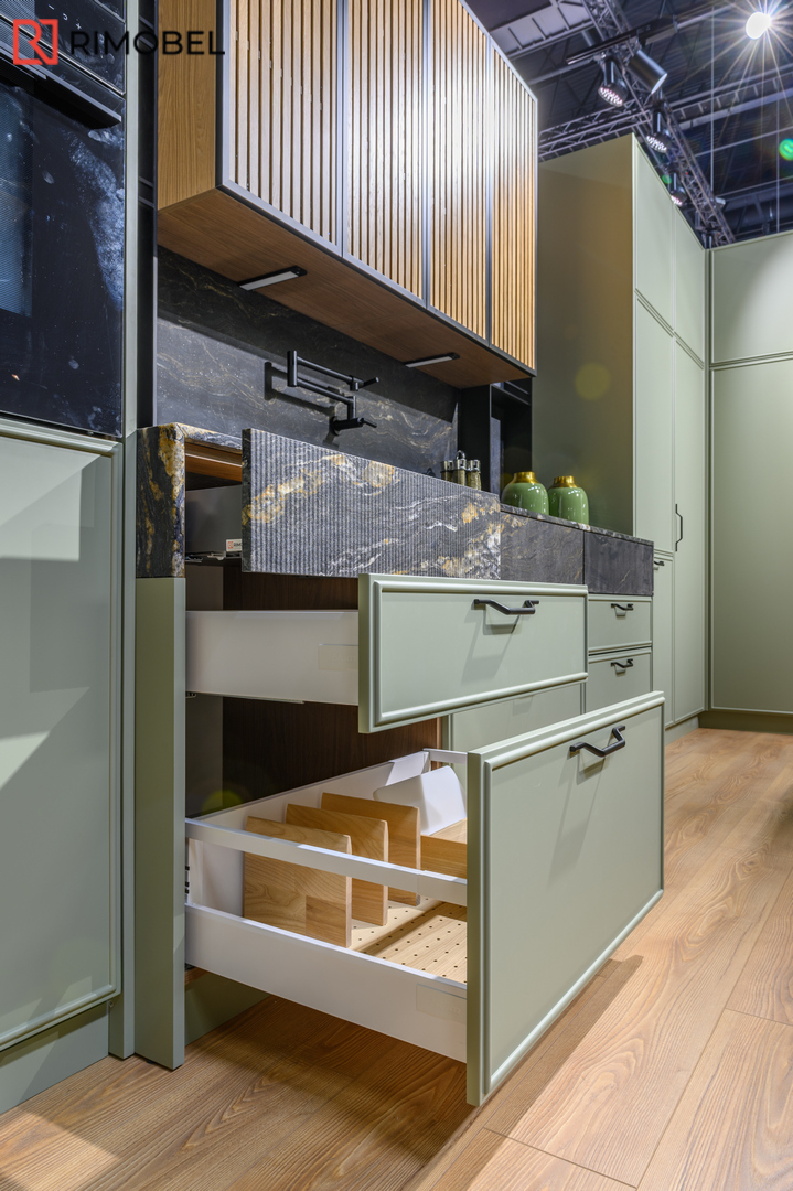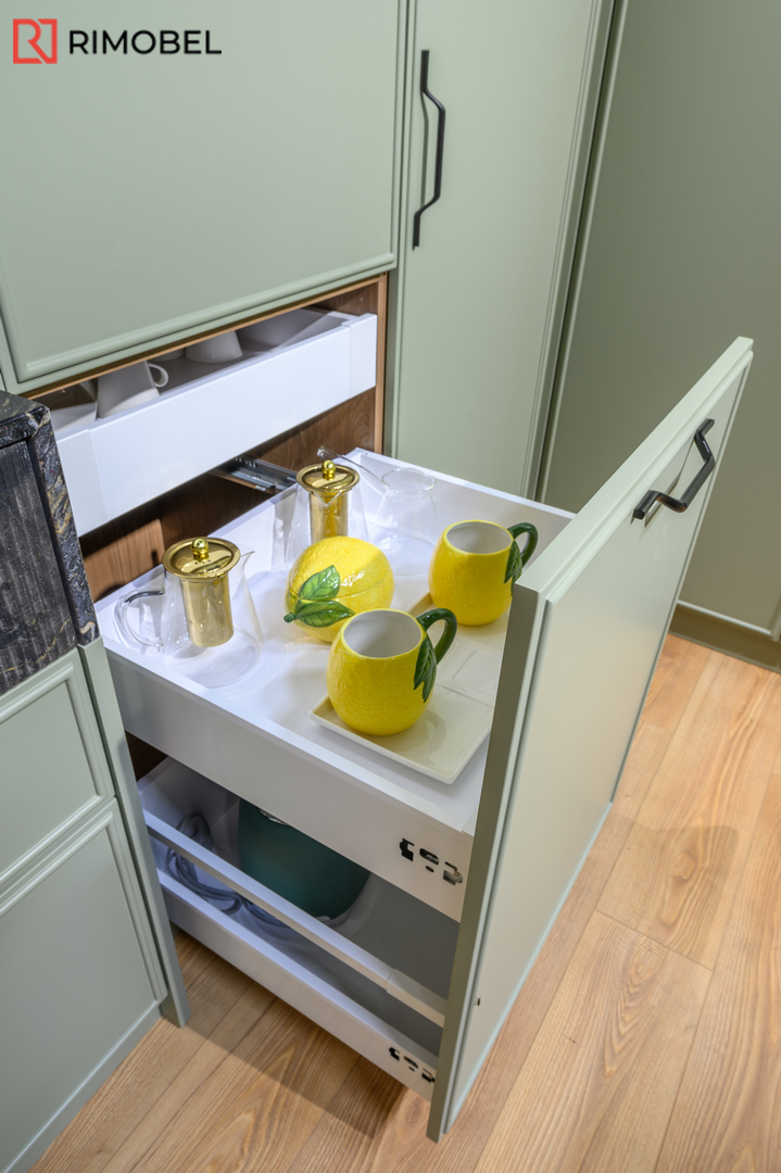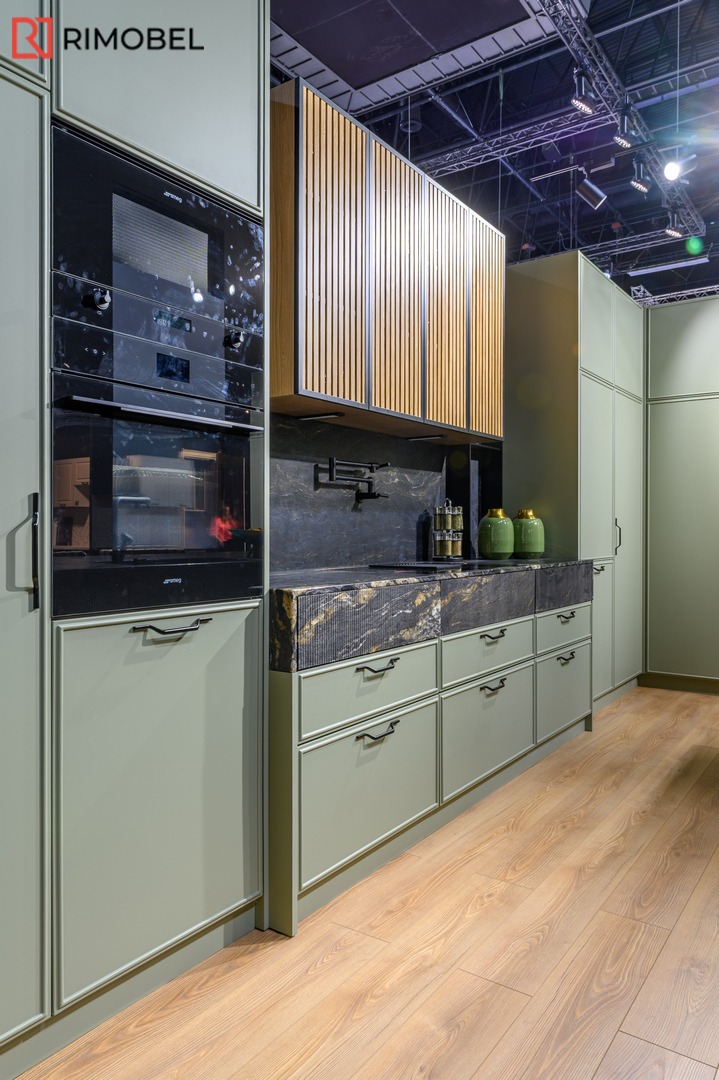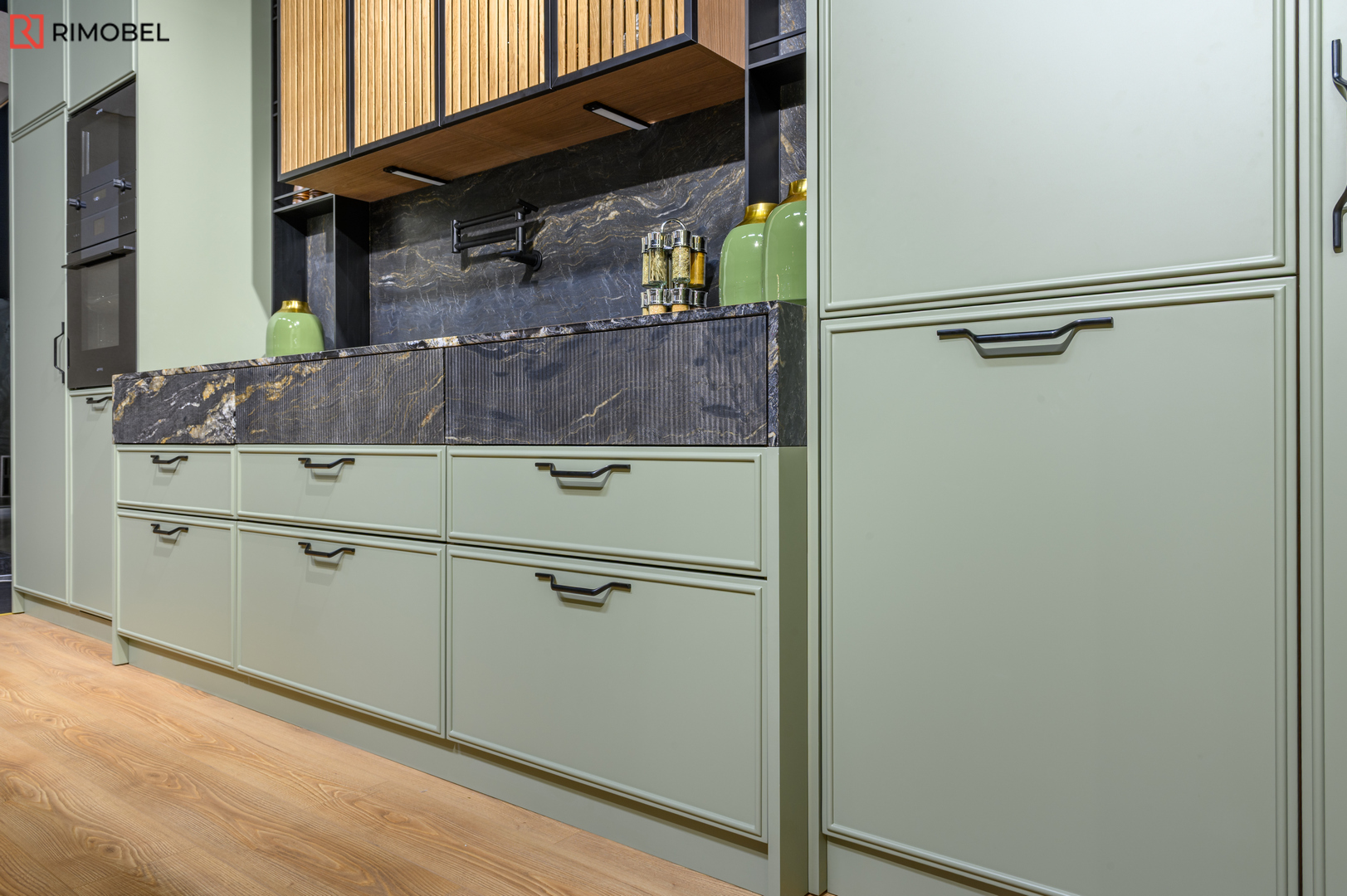 ✔️ Fronturile din MDF frezat 3D, vopsite într-o nuanță elegantă de verde fistic, conferă profunzime vizuală și aduc un aer sofisticat, cald și fresh în același timp.