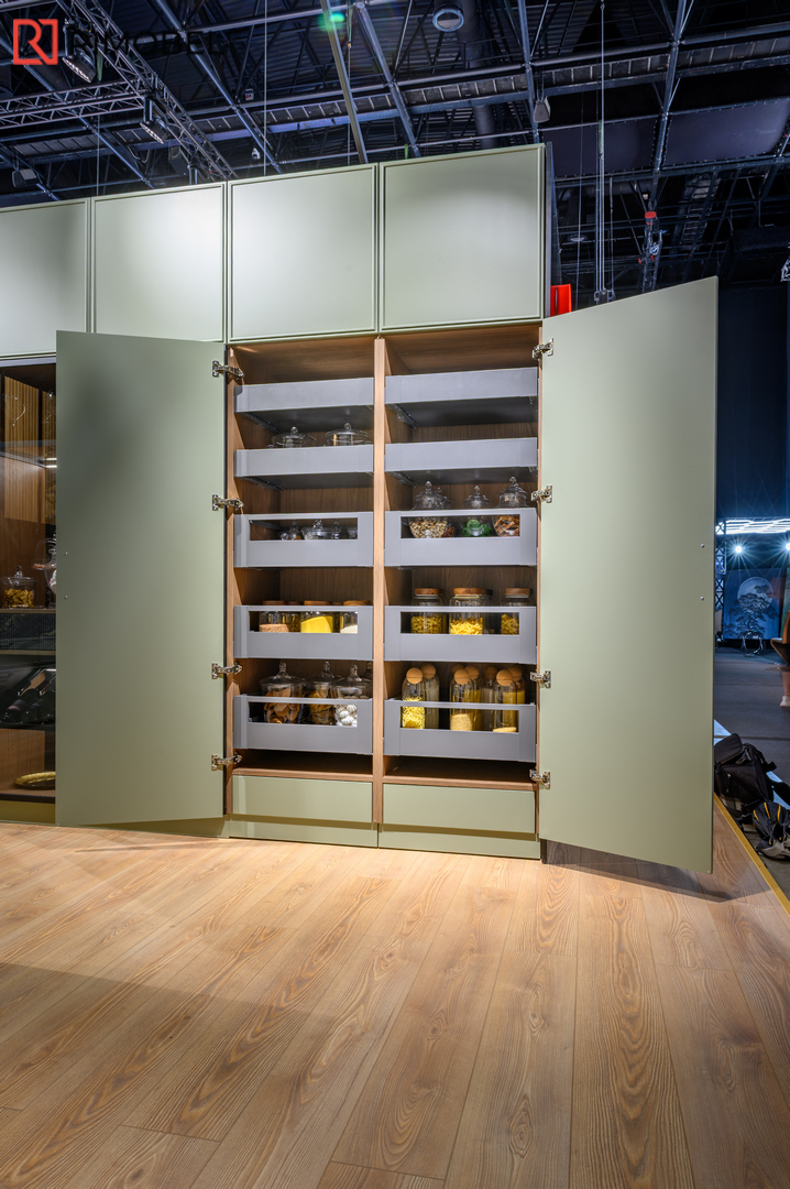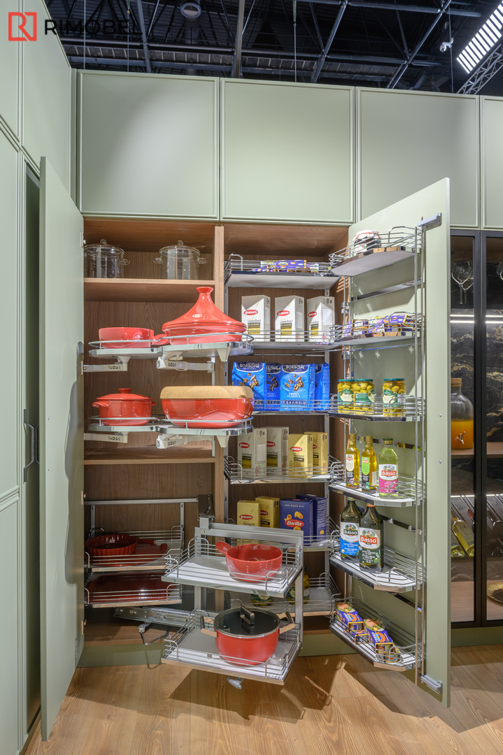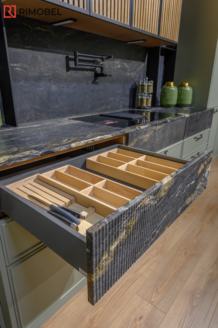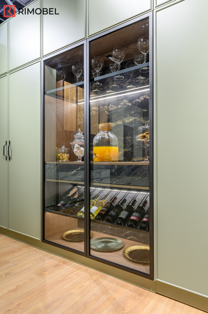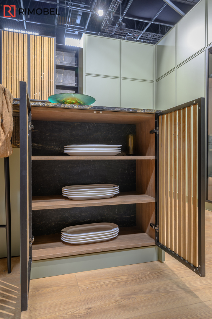 ✔️ Fronturile din MDF frezat 3D, vopsite într-o nuanță elegantă de verde fistic, conferă profunzime vizuală și aduc un aer sofisticat, cald și fresh în același timp.