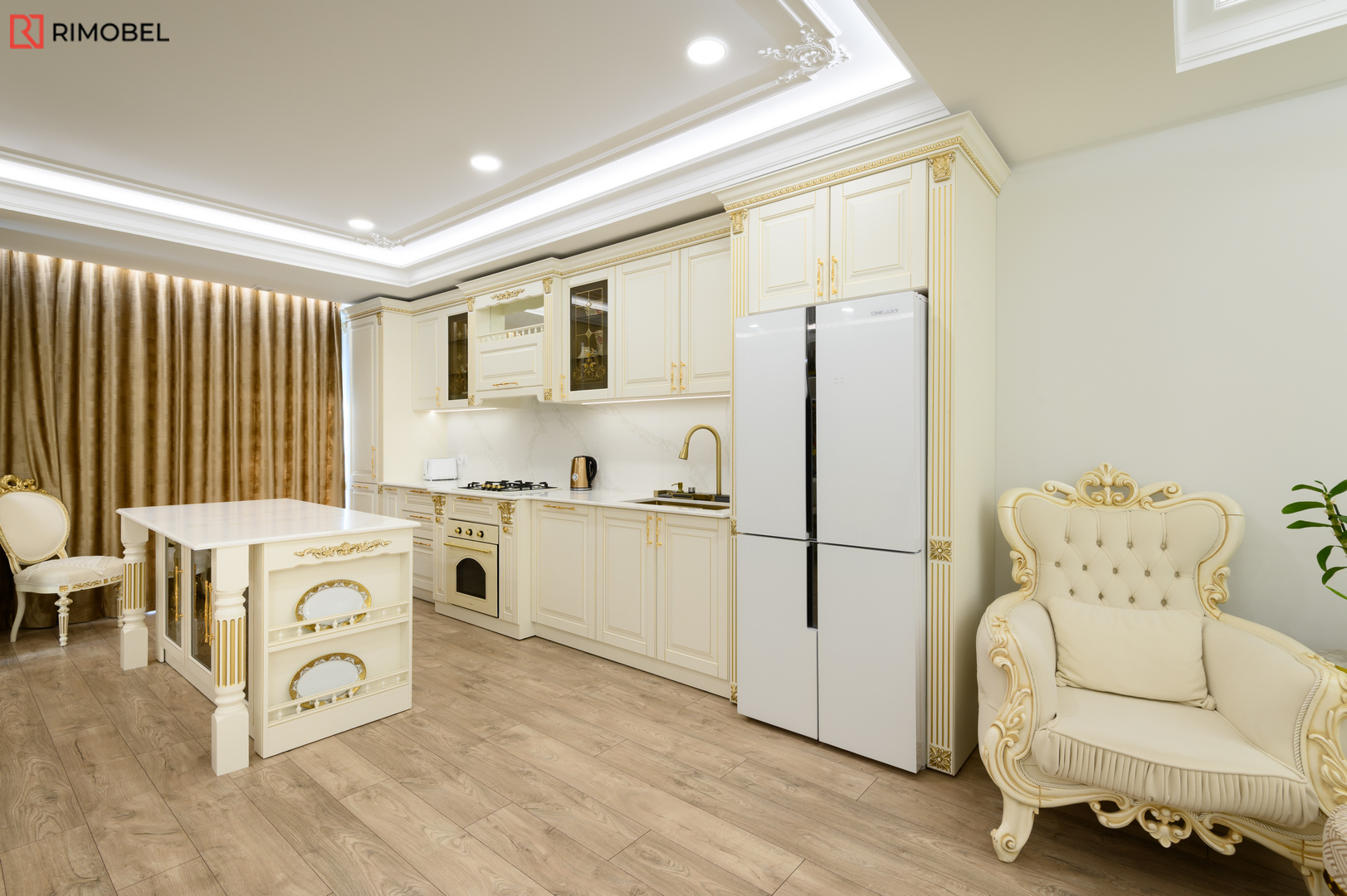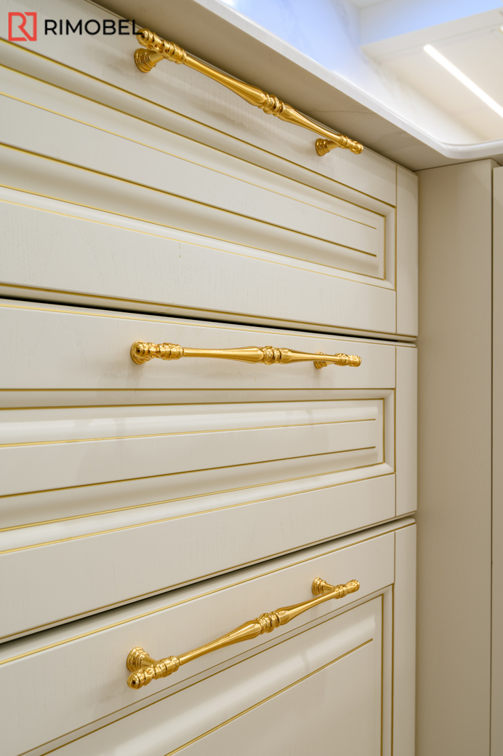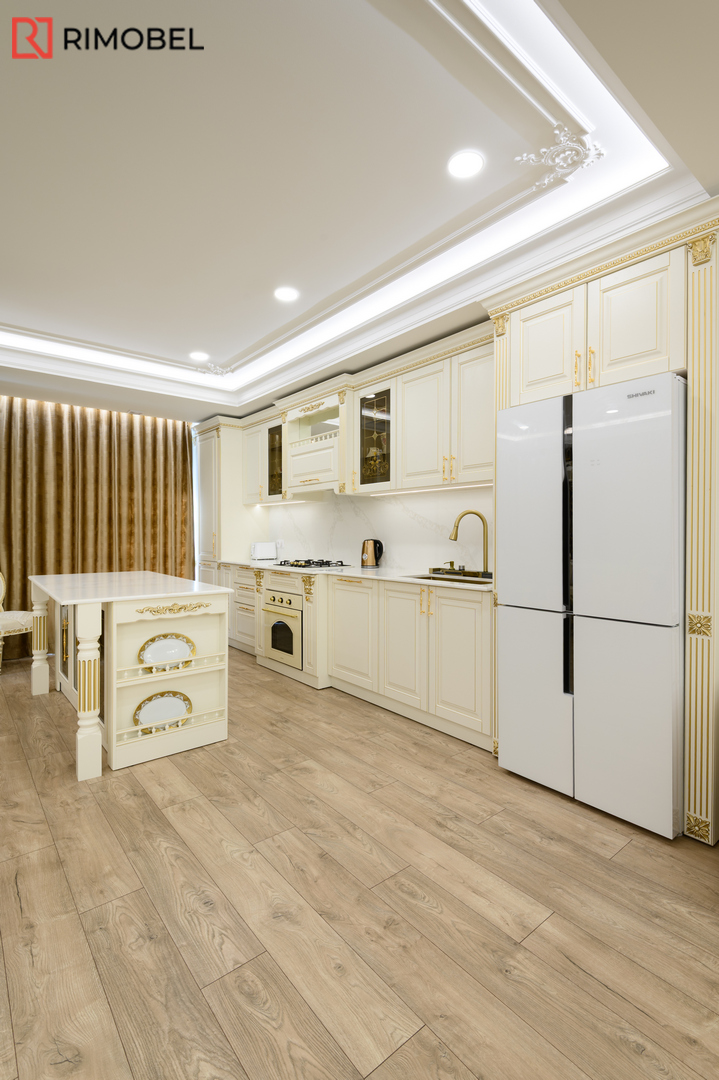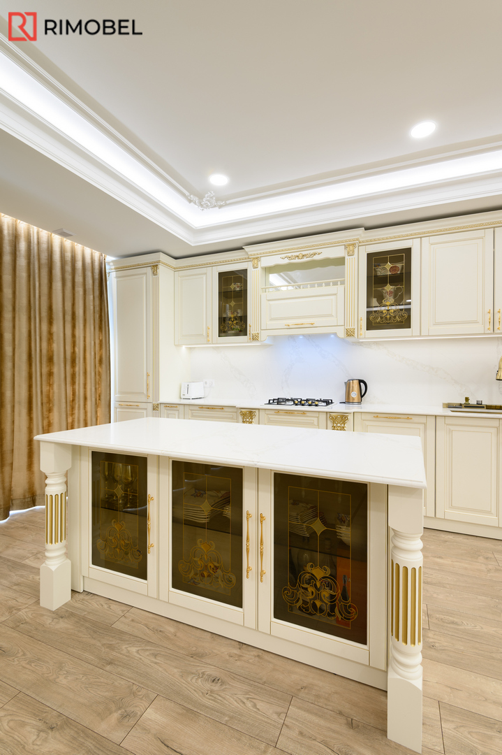 В этом просторном и элегантно организованном проекте Rimobel реализовал кухню, в которой классический стиль сочетается с продуманной функциональностью. Центральным элементом стала эффектная островная зона — не просто рабочая поверхность, а настоящая дизайнерская доминанта с декоративными пилястрами и столешницей из кварца с утончённой текстурой.