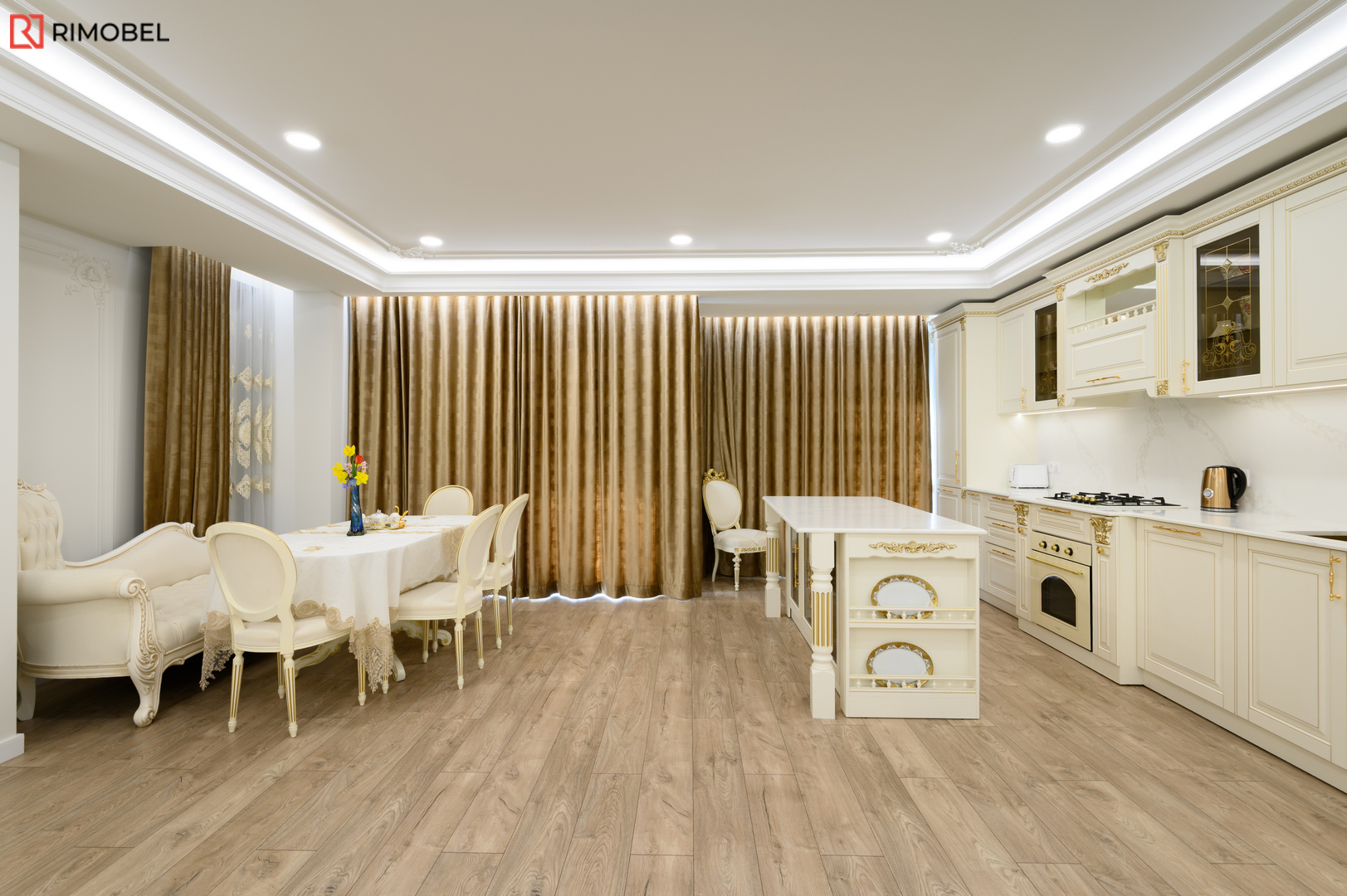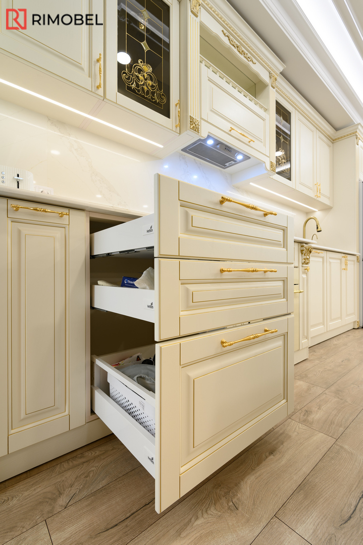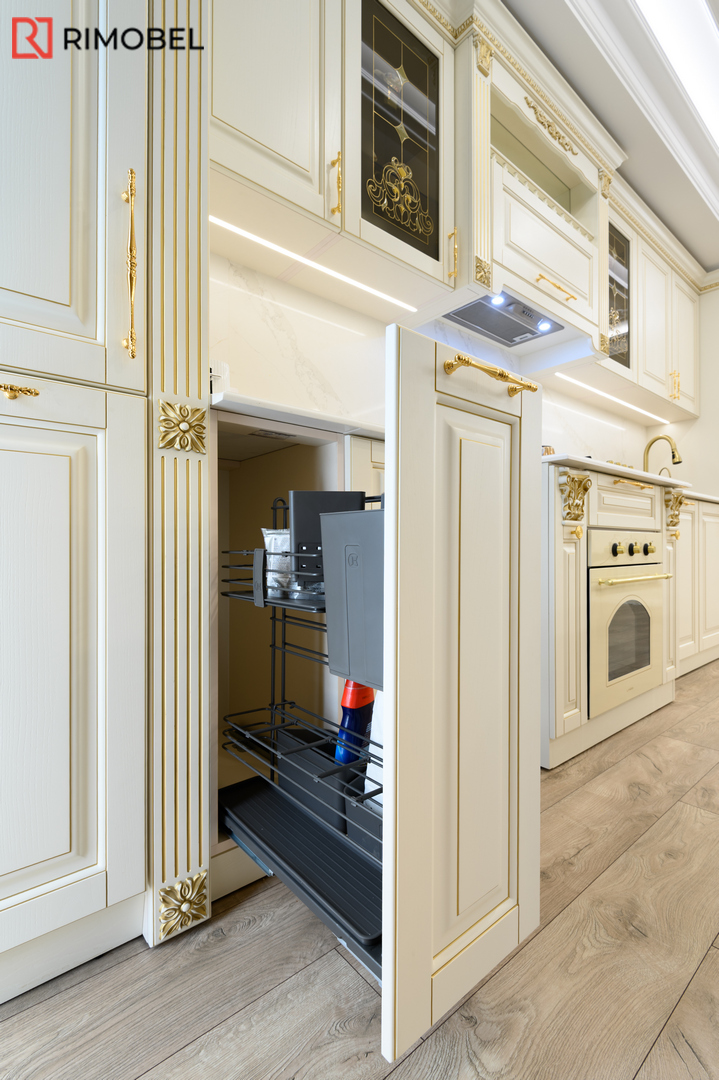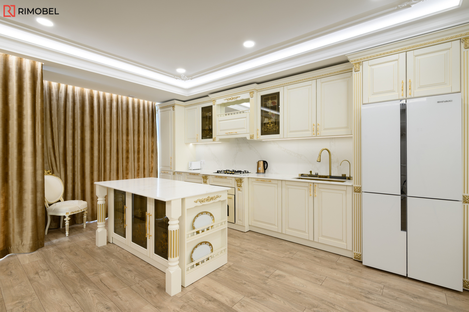 В этом просторном и элегантно организованном проекте Rimobel реализовал кухню, в которой классический стиль сочетается с продуманной функциональностью. Центральным элементом стала эффектная островная зона — не просто рабочая поверхность, а настоящая дизайнерская доминанта с декоративными пилястрами и столешницей из кварца с утончённой текстурой.