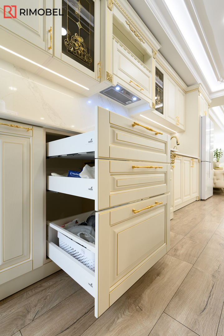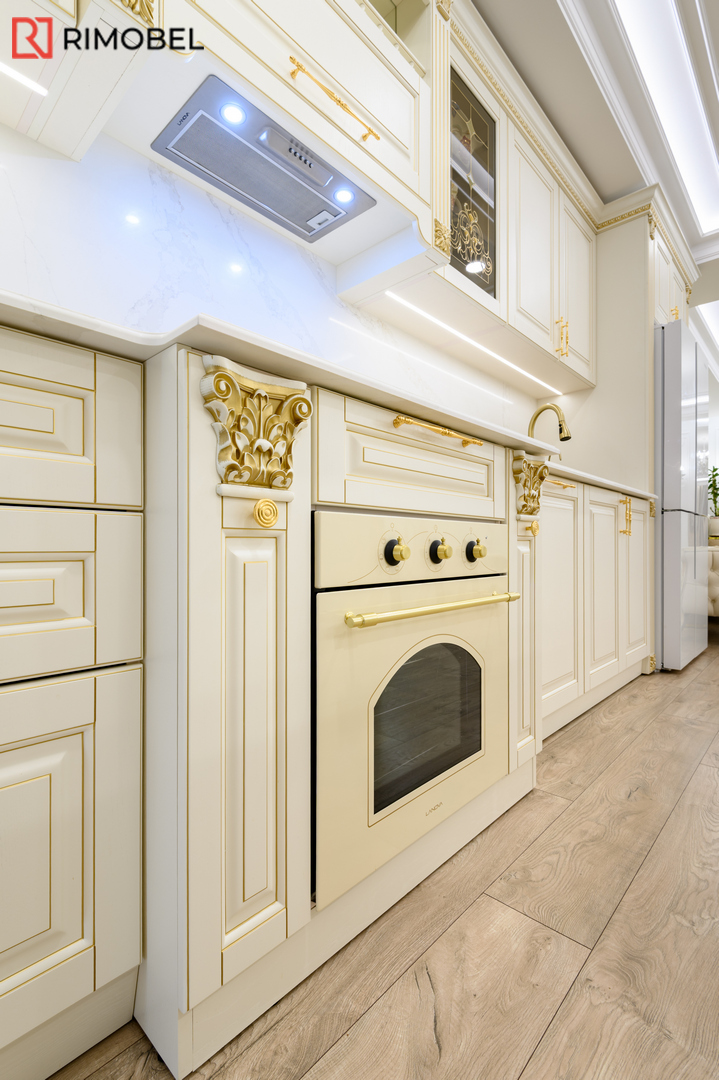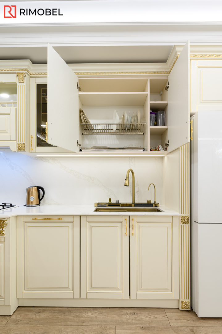Фасады: МДФ с 3D-фрезеровкой, покраска в цвет слоновой кости — классическая эстетика