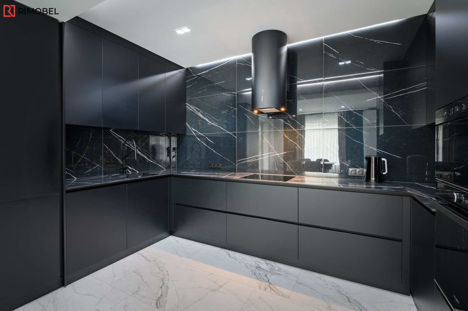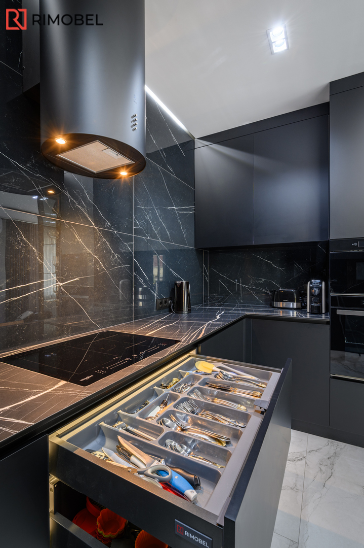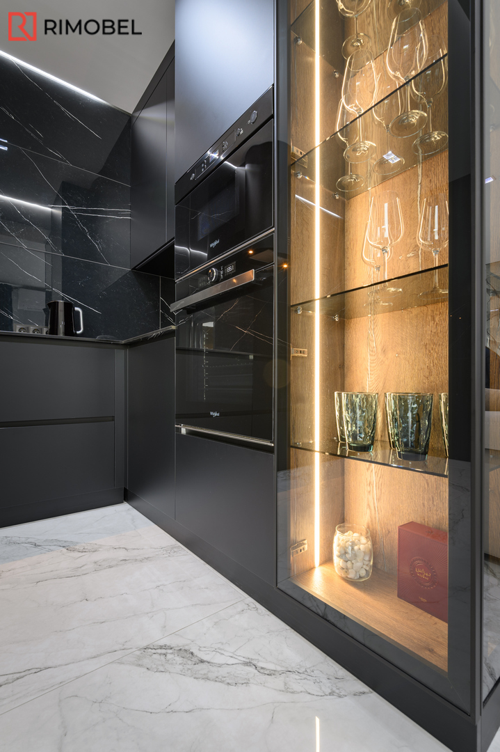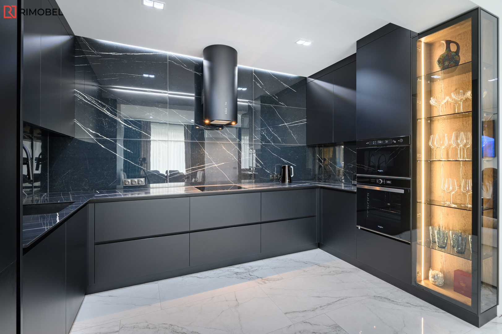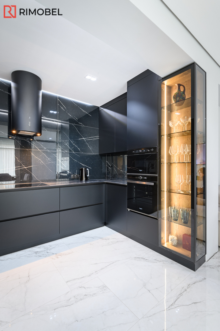 Спроектированная в форме «L», кухня рационально использует пространство и обеспечивает отличную эргономику для ежедневного использования. Фасады из матового крашеного МДФ в элегантном чёрном цвете придают интерьеру изысканный вид и легко вписываются как в современные, так и в минималистичные интерьеры.