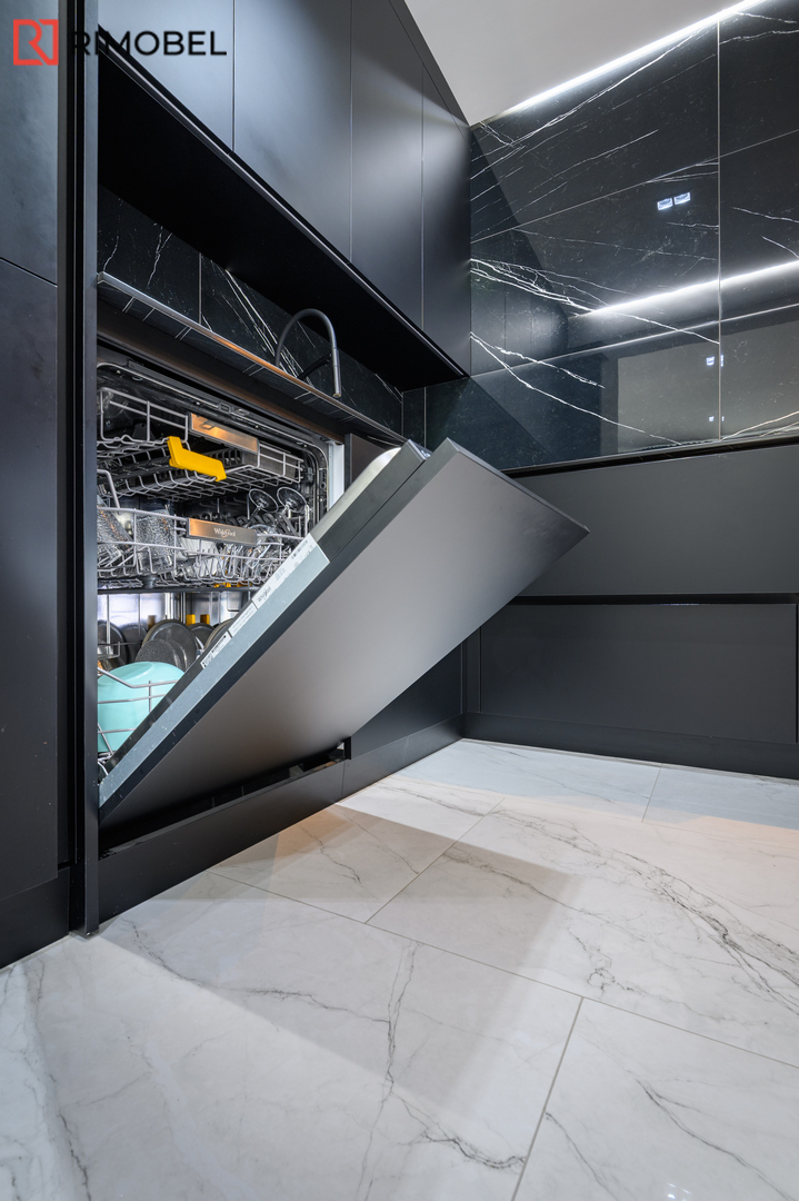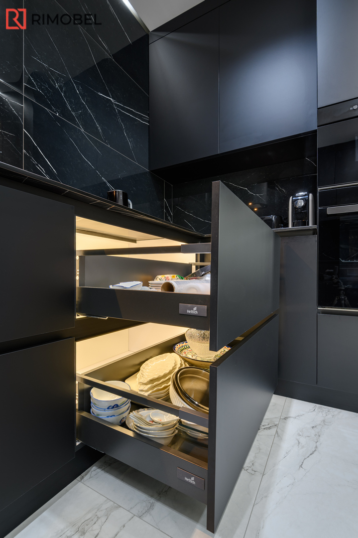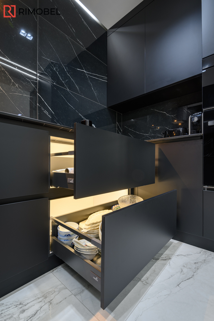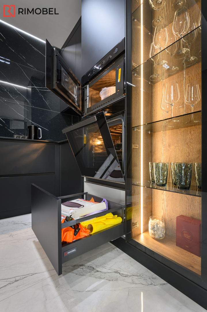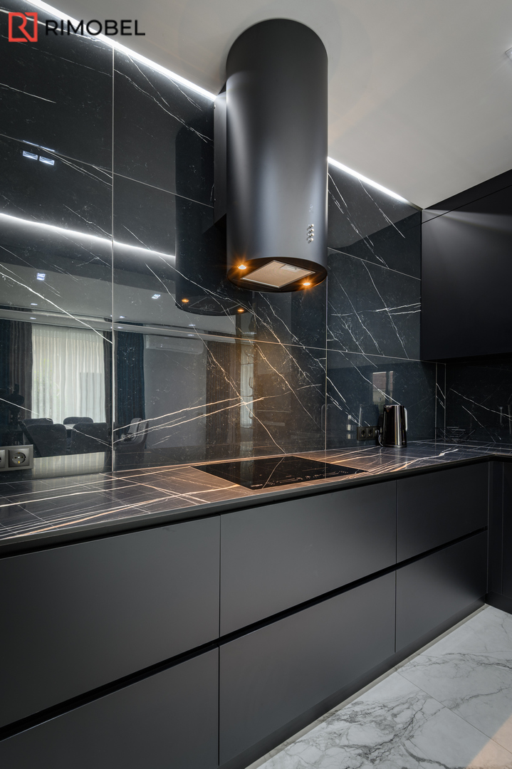 Спроектированная в форме «L», кухня рационально использует пространство и обеспечивает отличную эргономику для ежедневного использования. Фасады из матового крашеного МДФ в элегантном чёрном цвете придают интерьеру изысканный вид и легко вписываются как в современные, так и в минималистичные интерьеры.